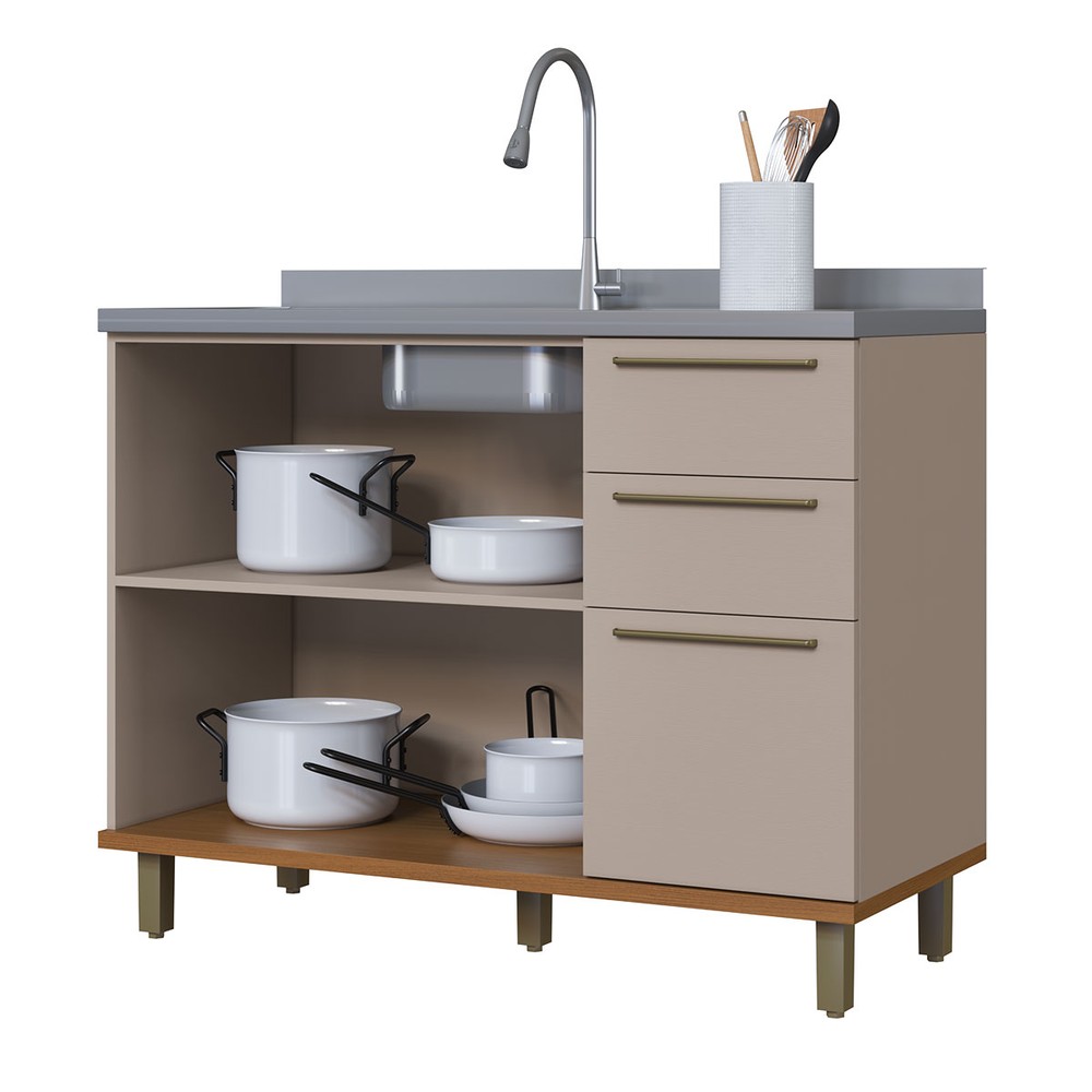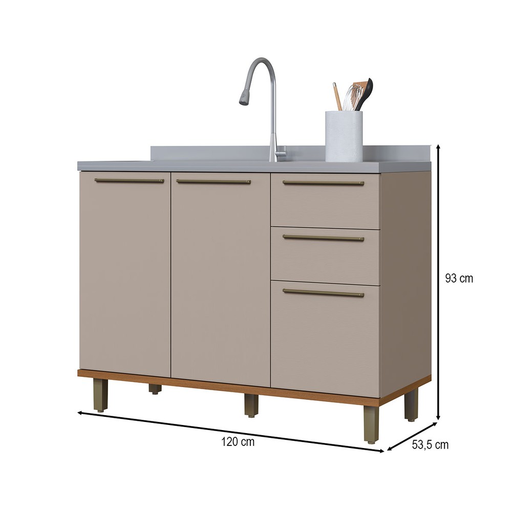 Balcão de Cozinha para Pia 120cm Munique 2 Portas 3 Gavetas Camurça - Indekes