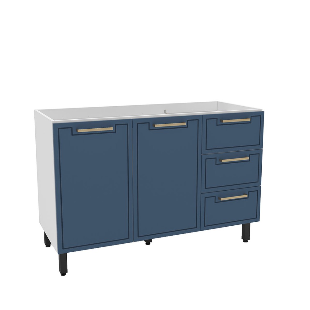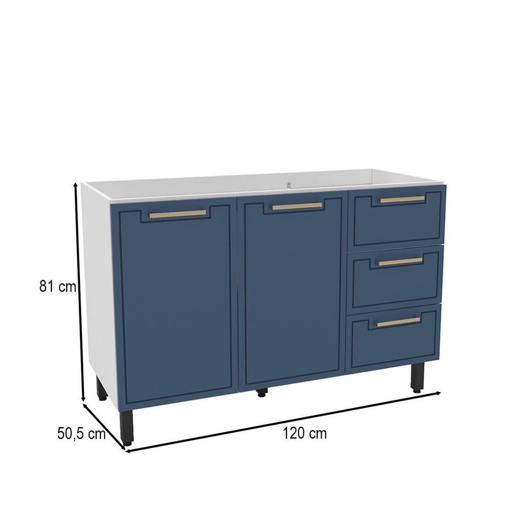 O(a) Balcão de Cozinha para Pia Amara 2 Portas 3 Gavetas Branco/Azul - Politorno é produzido em MDF e MDP na escala de brilho Semi-Fosco, e possui um grau de dificuldade de montagem: Médio.