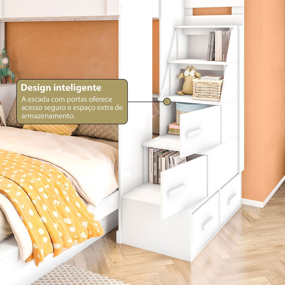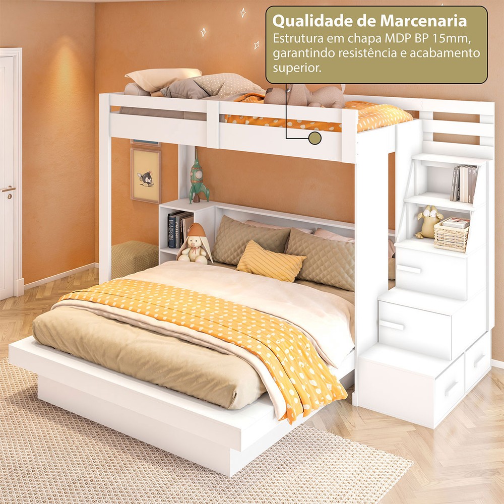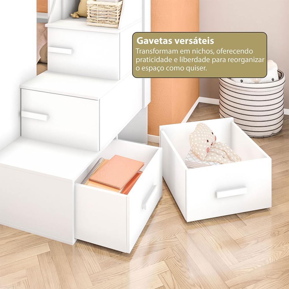 O(a) Beliche Luar 2 Gavetas com Escada Multifuncional Branco - Pnr Móveis é produzido em MDP na escala de brilho Fosca com Textura, e possui um grau de dificuldade de montagem: Médio.