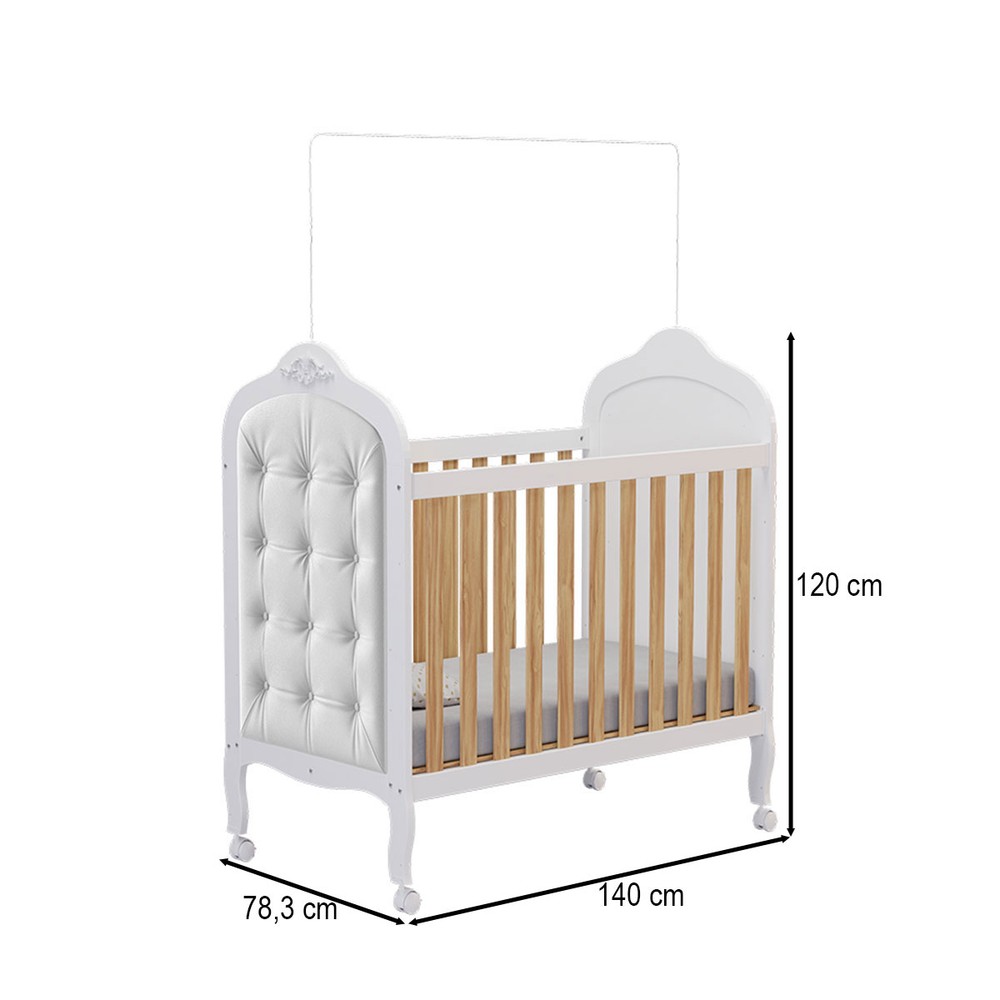 Observação Certificado do INMETRO: 000993/2017. Altura total com suporte cortinado: 164cm. Pode ser montado como Berço, ou Mini Cama, ou Mini Sofá. Revestido com tecido Corino no estilo Capitonê. Possui 4 rodízios com 6,8cm de altura, sendo 2 com travas. Estrado em MDF e laminado de madeira com 3 regulagens de altura. Pintura UV atóxica. Objetos decorativos que aparecem nas imagens, não acompanham o produto.