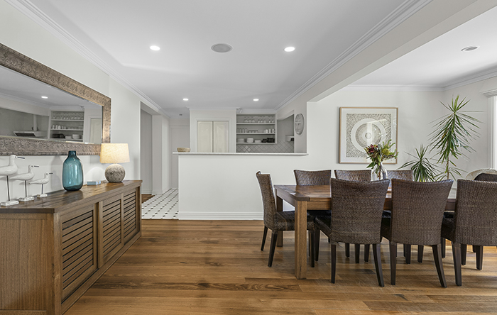 Como estamos pensando em um aparador para uma sala de jantar pequena, a melhor opção seria um modelo de 30 a 45 centímetros de profundidade com um comprimento proporcional ao espaço. É ideal manter um espaço de 90 a 110 centímetros entre o aparador e outros móveis, assim você garante uma sala de jantar com uma boa circulação e harmonia visual.