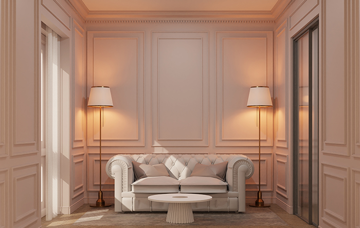 Estilo Clássico: No estilo clássico podemos ver referências ligadas aos palácios franceses, focados na elegância e requinte, esses geralmente são modelos mais bem trabalhados com cantoneiras detalhadas, aplicados em paredes inteiras ou para dividir meia parede. Para o estilo clássico de boiserie é usado materiais como gesso e madeiras, em tons como branco, dourado ou pastéis.