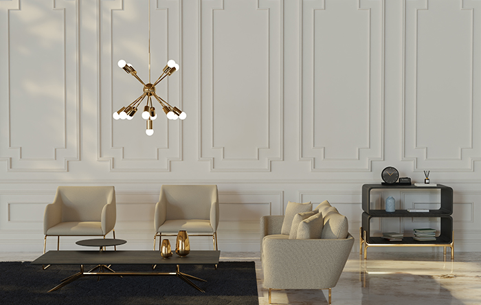 Estilo Industrial: O estilo industrial opta por boiseries mais retos, geométricos e minimalistas em tons escuros. Isso para combinar com as paredes de cimento ou tijolinhos à vista, deixando um visual moderno e urbano que é necessário para esse estilo decorativo. Ele adiciona um toque a mais e deixa um ambiente industrial mais aconchegante, para esse estilo a boiserie normalmente é feito de poliestireno, poliuretano ou até mesmo de metal.