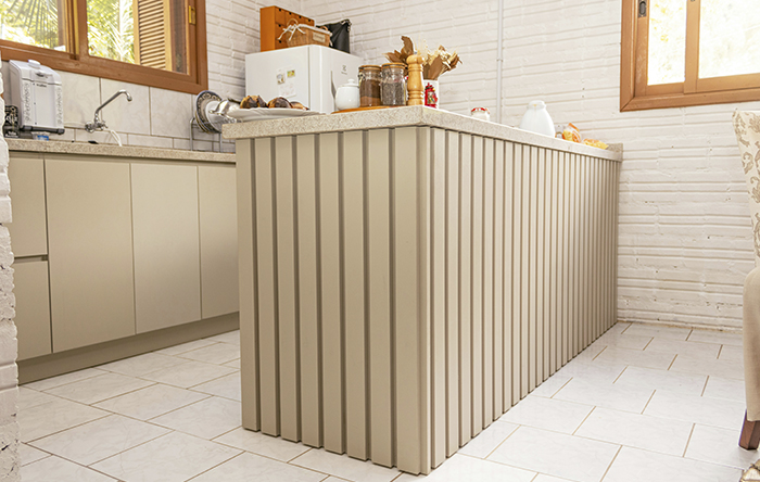 É importante saber que para pedras como granito e quartzo você não pode usar produtos ácidos ou abrasivos, sempre opte por produtos neutros para evitar manchas. A última dica é remover resíduos como massas ou substâncias secas: sempre use uma espátula de plástico, evitando esfregar para não riscar. E assim você vai prolongar a vida útil da sua bancada de cozinha americana.
