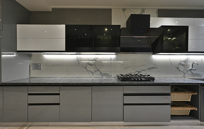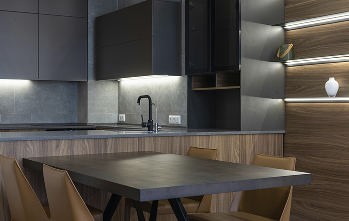 Ter uma iluminação que ajuda a realçar todos os pontos da sua cozinha é essencial. Para isso, você pode combinar uma iluminação branca neutra, entre 4000K e 5000K, na área de tarefas como as bancas e o fogão, e combinar com uma iluminação quente, entre 2700K a 3000K, em pontos específicos de detalhes, que ajudam a criar aconchego e dar profundidade ao ambiente.