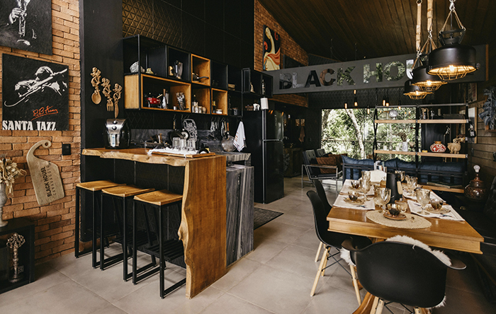 Além de ter uma boa composição e equilíbrio na paleta de cores, a iluminação também é essencial para não deixar esse ambiente frio, mas sim acolhedor. Para isso a principal dica é usar pendentes de metal, esses que são peças grandes e mais robustas – normalmente em preto fosco, cobre ou em alumínio envelhecido –, essas luminárias são ideais para ficar sobre a mesa de jantar e bancada de cozinha, de preferência com uma iluminação amarelada.