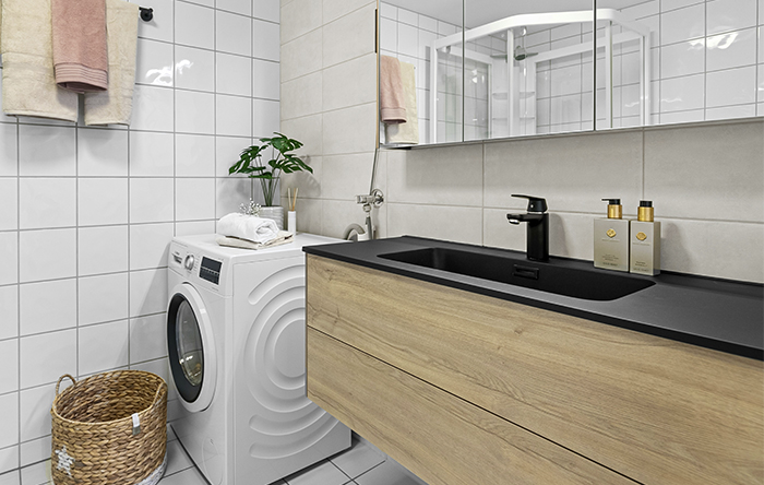 Para a lavanderia, já existem alguns modelos de racks feitos especificamente para esse cômodo. Nesse ambiente, você pode usar o rack acima da máquina de lavar para organizar itens de lavanderia, como amaciantes, sabão em pó e outros produtos. Você também pode utilizá-lo para organizar e armazenar toalhas e produtos de limpeza. Para os modelos de rack mais altos, o espaço interno pode ser usado para guardar o cesto de roupa suja, mantendo-o discreto na lavanderia.