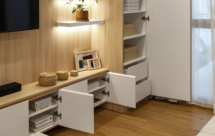 Este é um dos ambientes onde mais vemos o rack, pois ele é frequentemente usado para apoiar a TV, organizar itens decorativos, servir como armazenamento e esconder cabos. Além disso, alguns modelos podem ser utilizados como assentos extras na parte de trás, sendo uma opção perfeita para salas pequenas.
