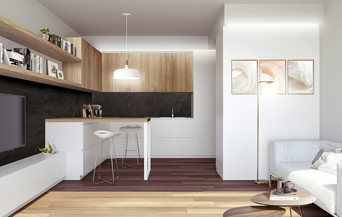 Outra dica é usar a repetição de um material. Um exemplo pode ser a madeira: se você usar uma madeira para os móveis da cozinha, você pode repetir isso nos móveis da sala, assim criando uma sensação de unidade e harmonia. Com isso, você consegue ter um ambiente harmonioso que conversem entre si, mas que ainda cumpram suas funções.