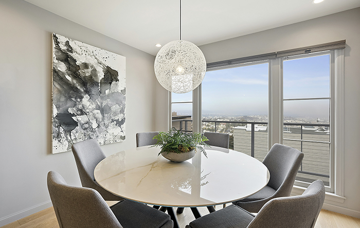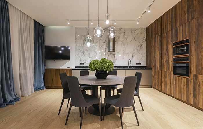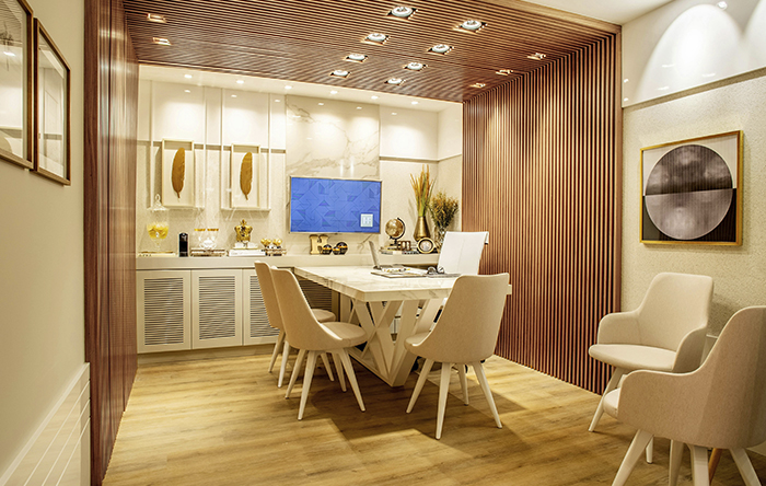 O que pode ajudar também é ter pendentes na altura correta, onde devem ficar entre 80 a 90 centímetros acima da mesa, assim não vão ofuscar e atrapalhar durante as refeições. Use lâmpadas em branco neutro ou quente, pois deixam o ambiente mais íntimo e convidativo. Além disso, use a iluminação de apoio para buffets, aparadores ou paredes, trazendo profundidade ao ambiente. Assim você consegue ter uma iluminação convidativa, ampliar o ambiente e deixá-lo maior.