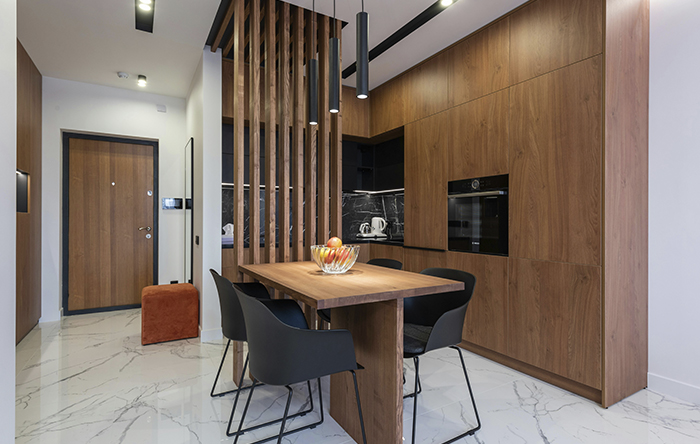 O segundo passo é a escolha dos móveis, que como sabemos é crucial para um ambiente funcional. Para isso vamos começar as dicas com a mesa: o melhor modelo é a mesa redonda, isso porque a falta de quinas facilita a circulação e consegue melhorar a circulação pelo ambiente, mas as mesas retangulares também podem ser usadas, principalmente em cozinhas mais estreitas, onde você pode deixar um lado dela encostado na parede, assim otimizando a parede contrária para móveis e decoração.