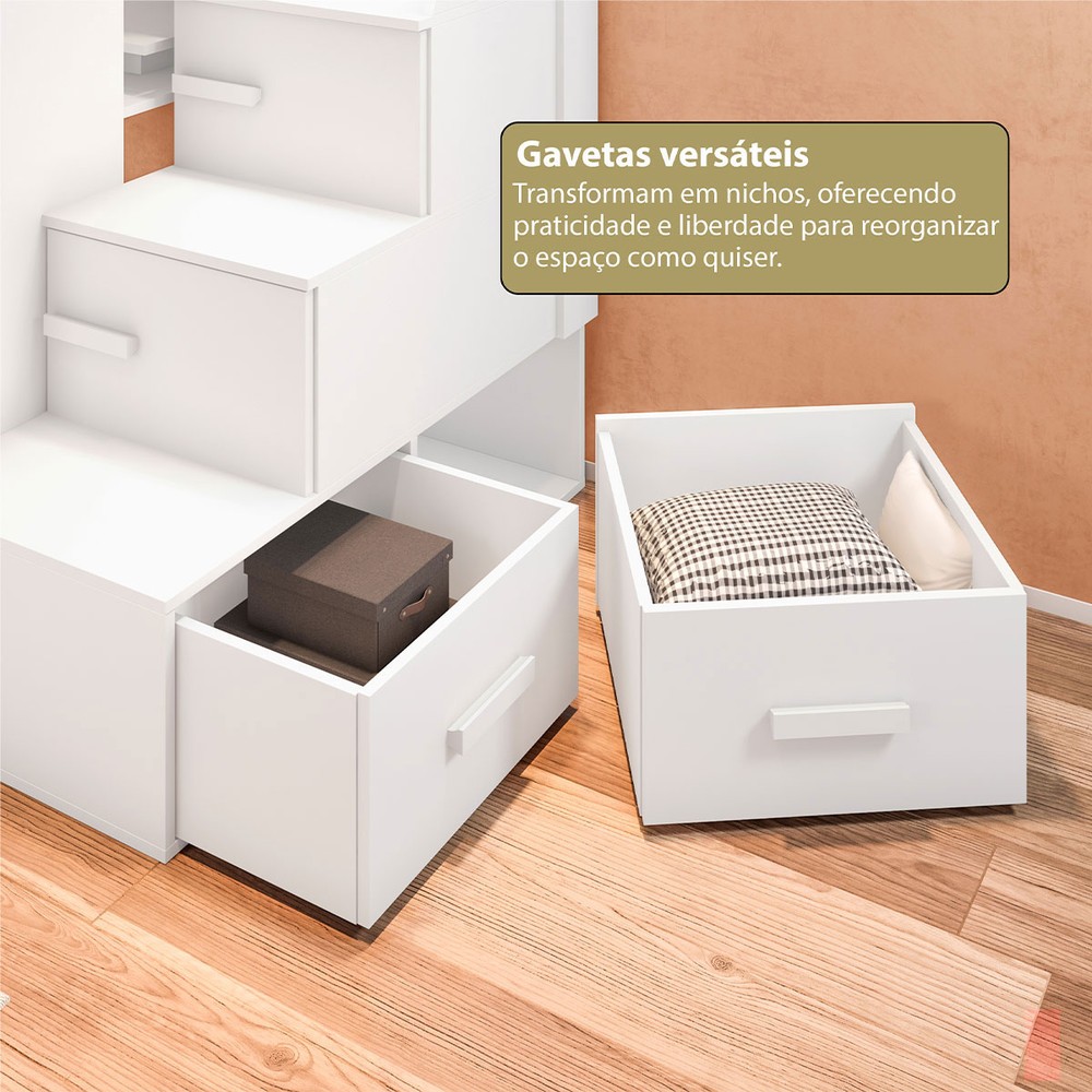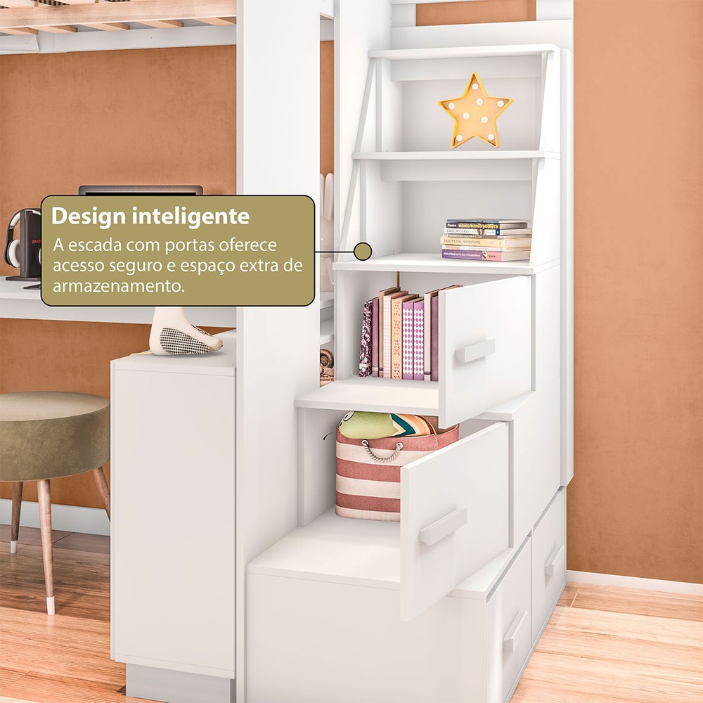 O(a) Cama Infantil Luar 5 Portas 2 Gavetas com Escrivaninha Branco - Pnr Móveis é produzido em MDP na escala de brilho Fosca com Textura, e possui um grau de dificuldade de montagem: Difícil.
