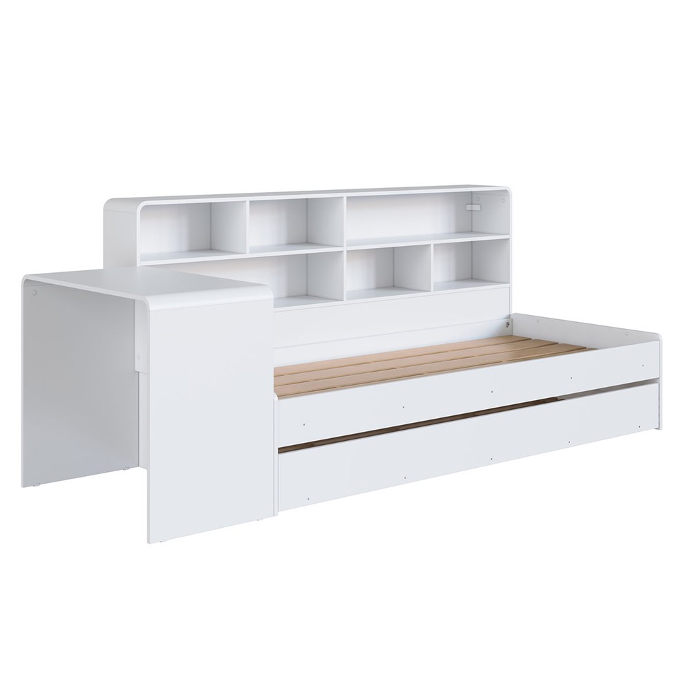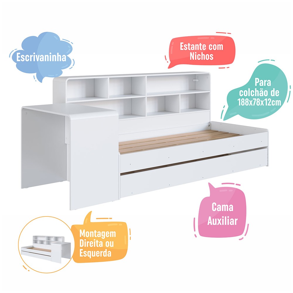 Cama Solteiro Infanto Juvenil com Escrivaninha para Estudo Estante e Cama Auxiliar Branco - Completa Móveis