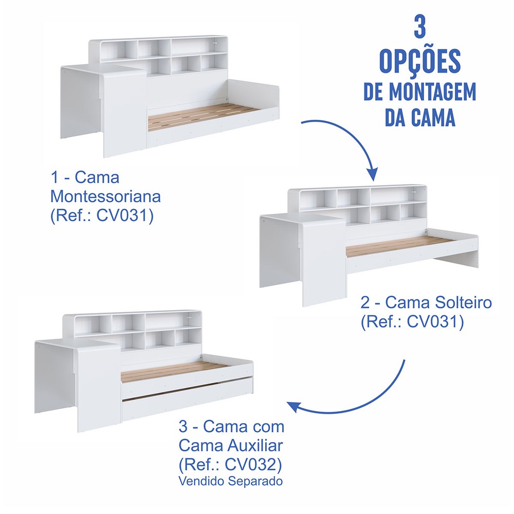 Acompanha Cama Solteiro + Escrivaninha + Estante + Cama Auxiliar + Kit Ferragens + Manual de Montagem