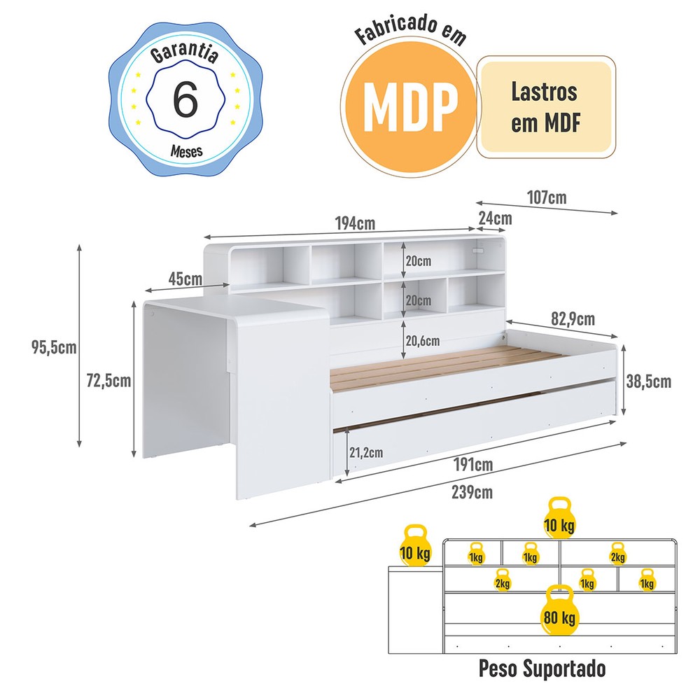 O(a) Cama Solteiro Infanto Juvenil com Escrivaninha para Estudo Estante e Cama Auxiliar Branco - Completa Móveis é produzido em MDP na escala de brilho Fosco, e possui um grau de dificuldade de montagem: Médio.