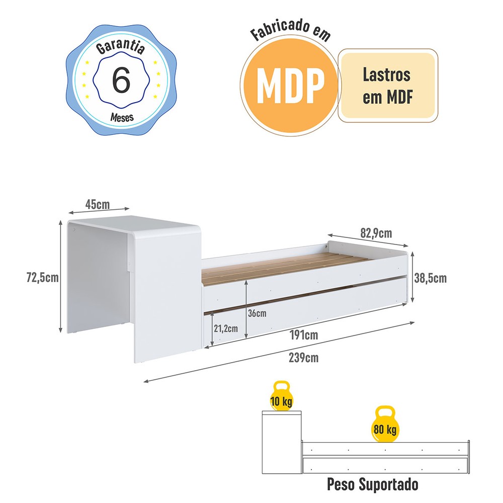 O(a) Cama Solterio Infanto Juvenil com Escrivaninha e Cama Auxiliar Branco - Completa Móveis é produzido em MDP na escala de brilho Fosco, e possui um grau de dificuldade de montagem: Médio.