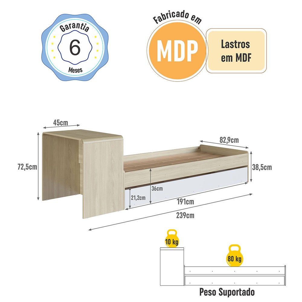 O(a) Cama Solterio Infanto Juvenil com Escrivaninha e Cama Auxiliar Carvalho/Branco - Completa Móveis é produzido em MDP na escala de brilho Fosco, e possui um grau de dificuldade de montagem: Médio.