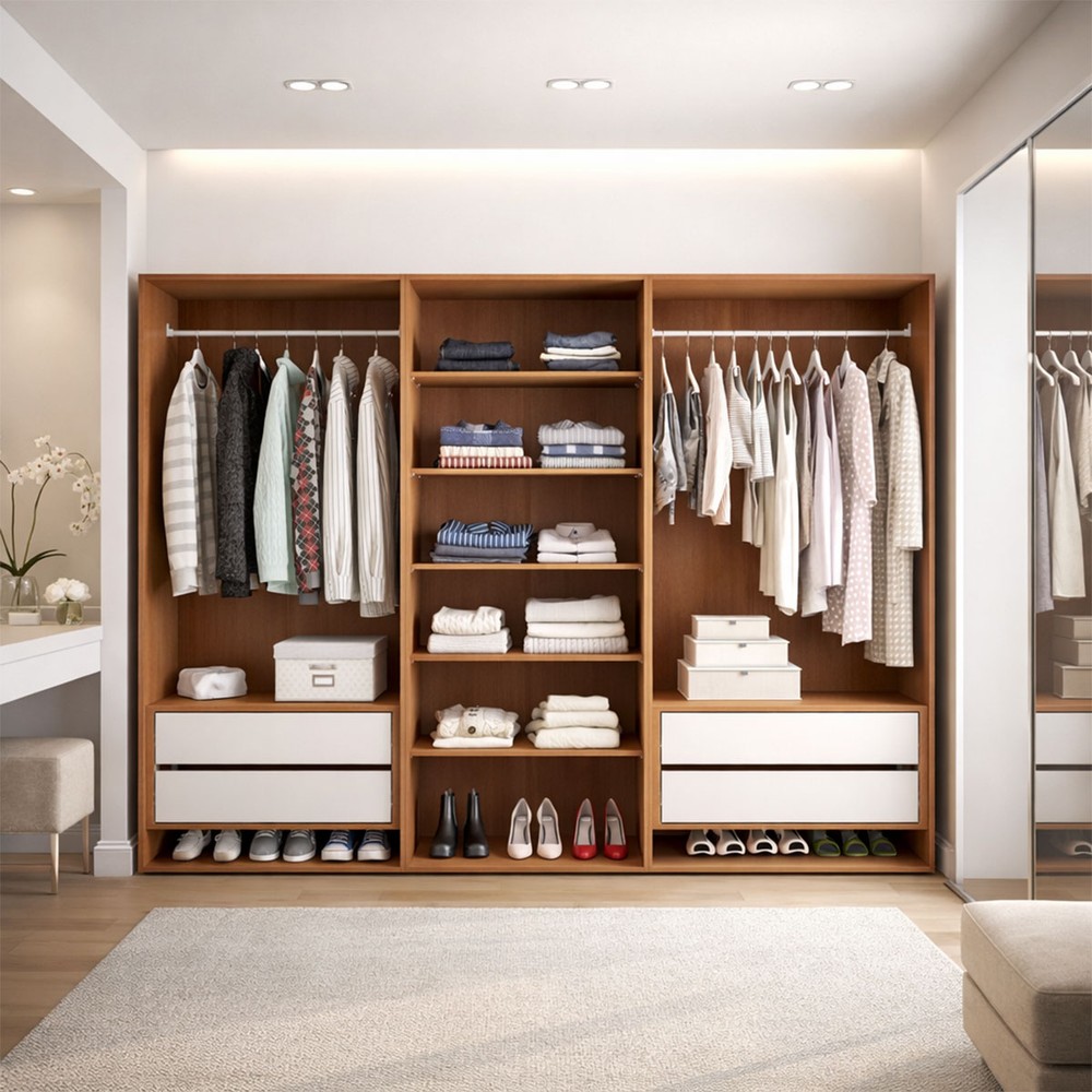 O(a) Closet Luna 4 Gavetas 5 Prateleiras Creme/Freijó - Politorno é produzido em MDP na escala de brilho Semi-Fosco, e possui um grau de dificuldade de montagem: Médio.