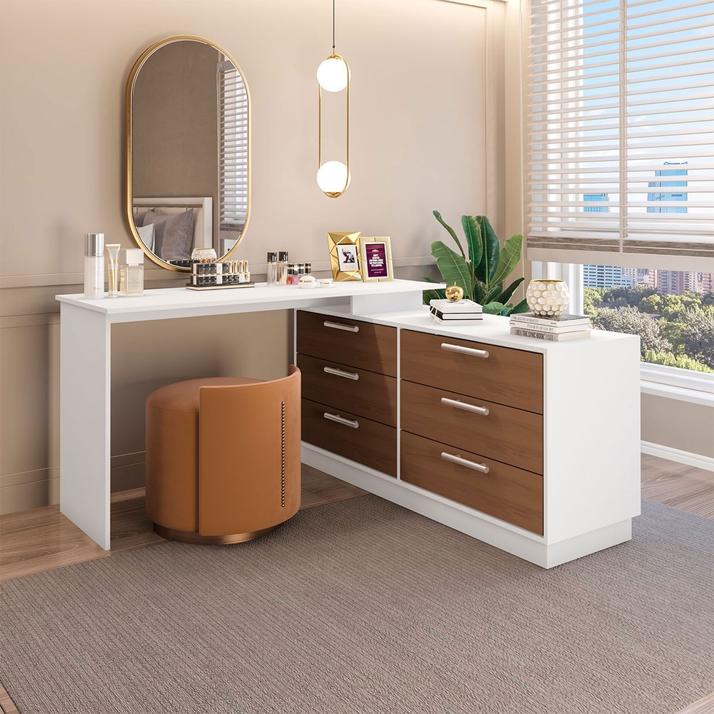 O(a) Cômoda com Mesa Escrivaninha Rocher 6 Gavetas Branco/Freijó - Pnr Móveis é produzido em MDP na escala de brilho Fosca com Textura, e possui um grau de dificuldade de montagem: Médio.