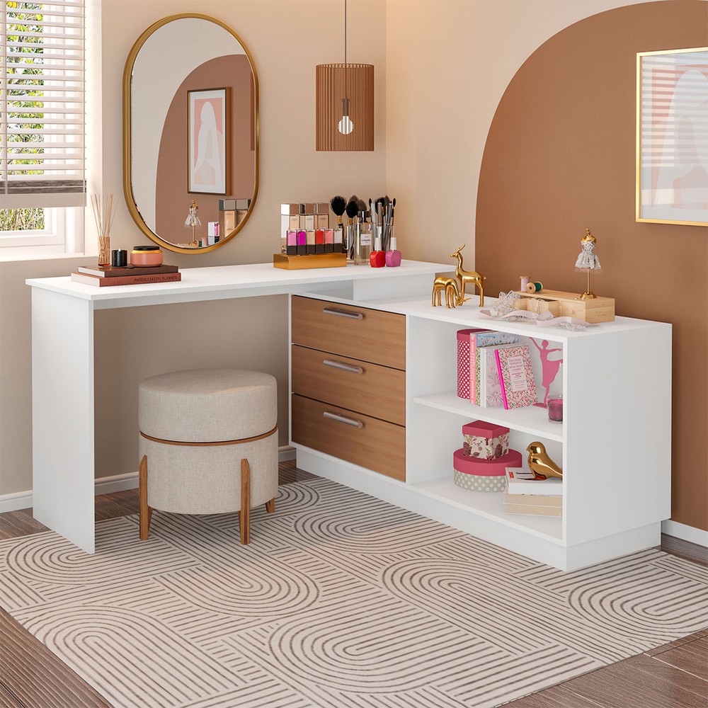 O(a) Cômoda com Penteadeira Rocher 3 Gavetas 2 Nichos Branco/Freijó - Pnr Móveis é produzido em MDP na escala de brilho Fosca com Textura, e possui um grau de dificuldade de montagem: Médio.