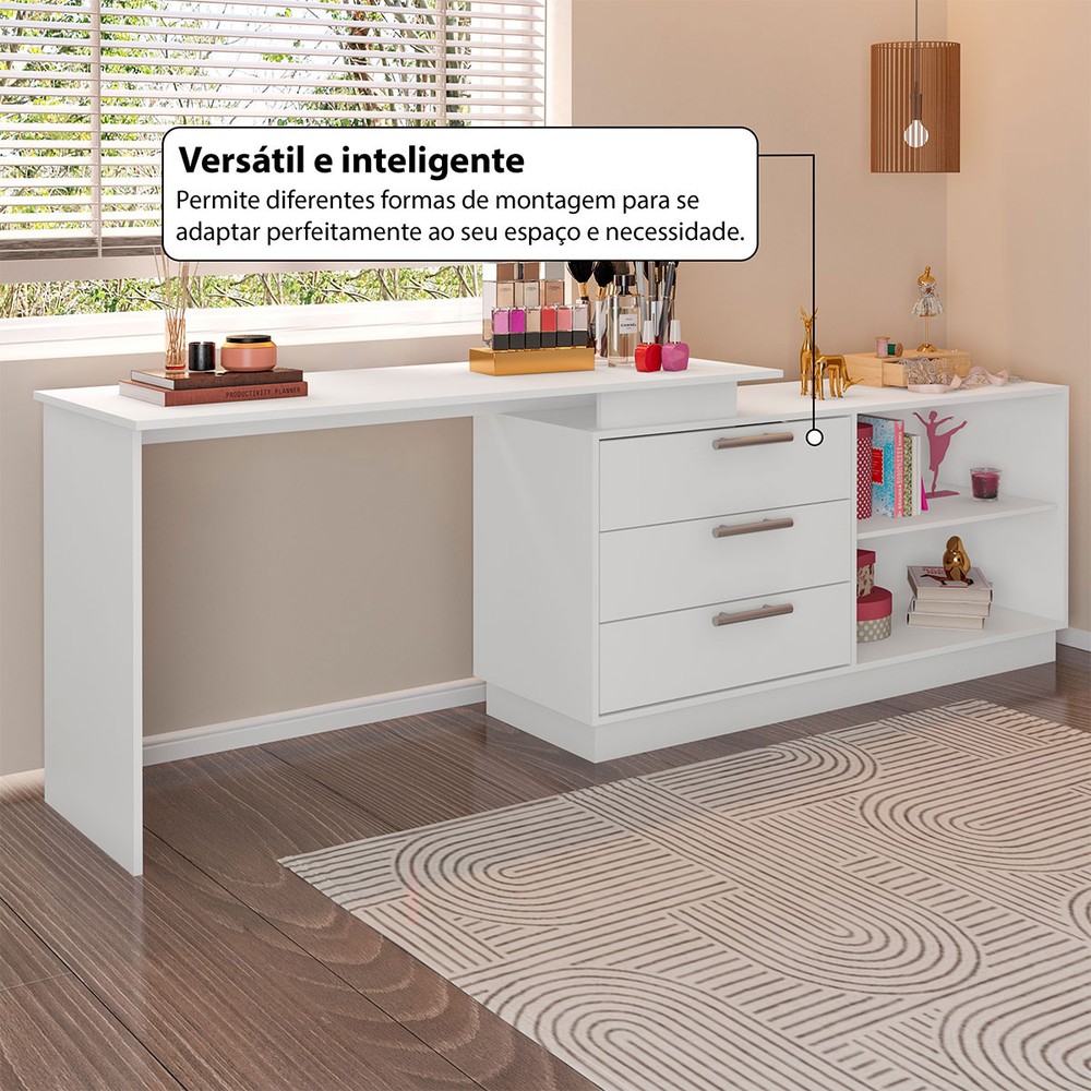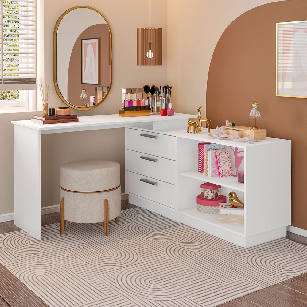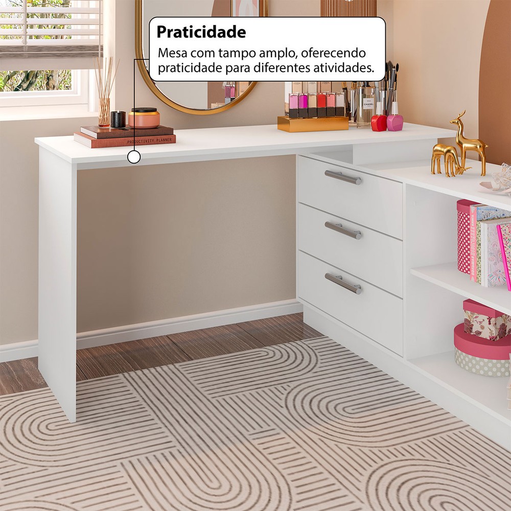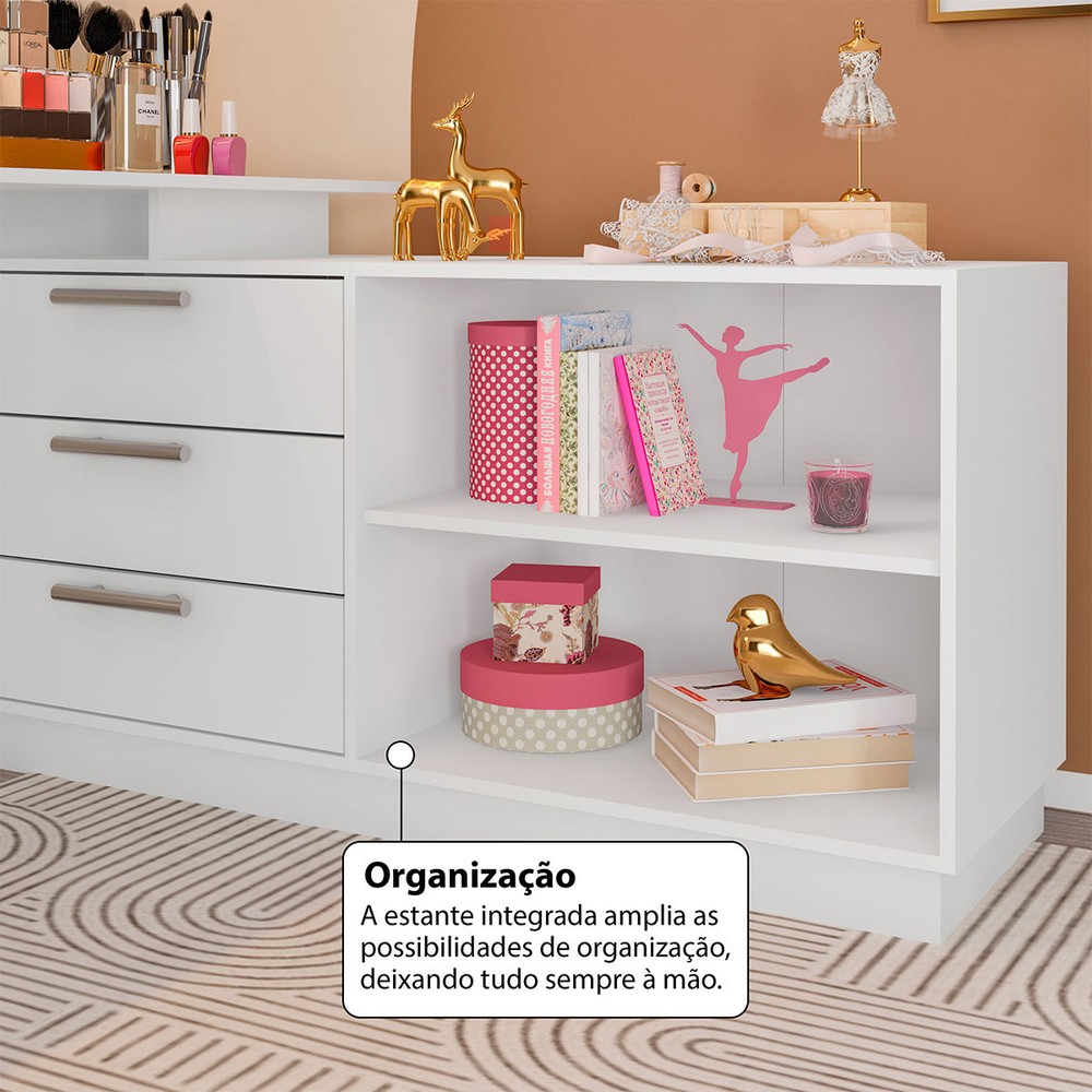 O(a) Cômoda com Penteadeira Rocher 3 Gavetas 2 Nichos Branco - Pnr Móveis é produzido em MDP na escala de brilho Fosca com Textura, e possui um grau de dificuldade de montagem: Médio.