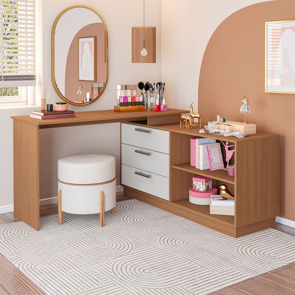 O(a) Cômoda com Penteadeira Rocher 3 Gavetas 2 Nichos Freijó/Branco - Pnr Móveis é produzido em MDP na escala de brilho Fosca com Textura, e possui um grau de dificuldade de montagem: Médio.