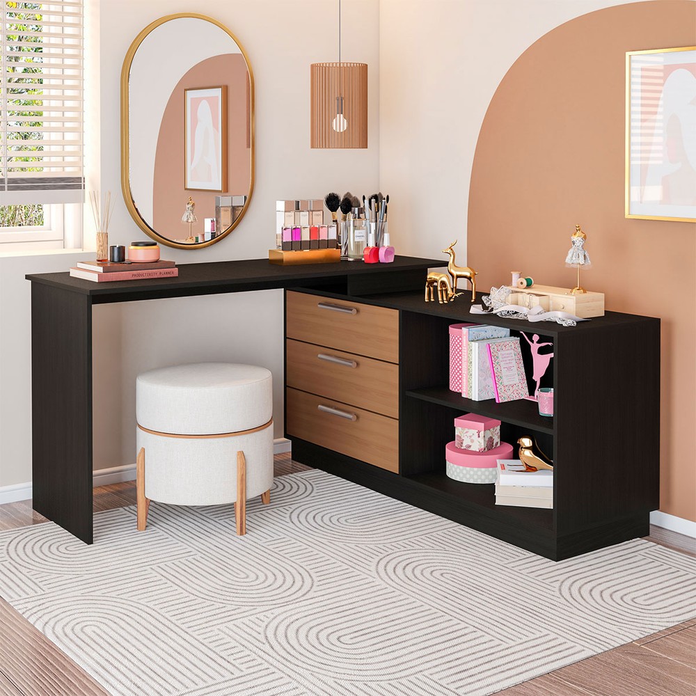 O(a) Cômoda com Penteadeira Rocher 3 Gavetas 2 Nichos Preto/Freijó - Pnr Móveis é produzido em MDP na escala de brilho Fosca com Textura, e possui um grau de dificuldade de montagem: Médio.