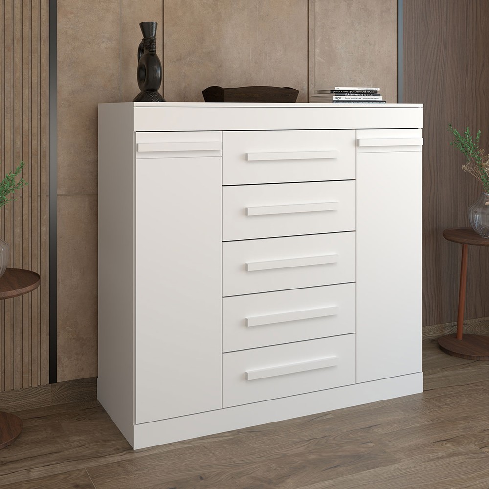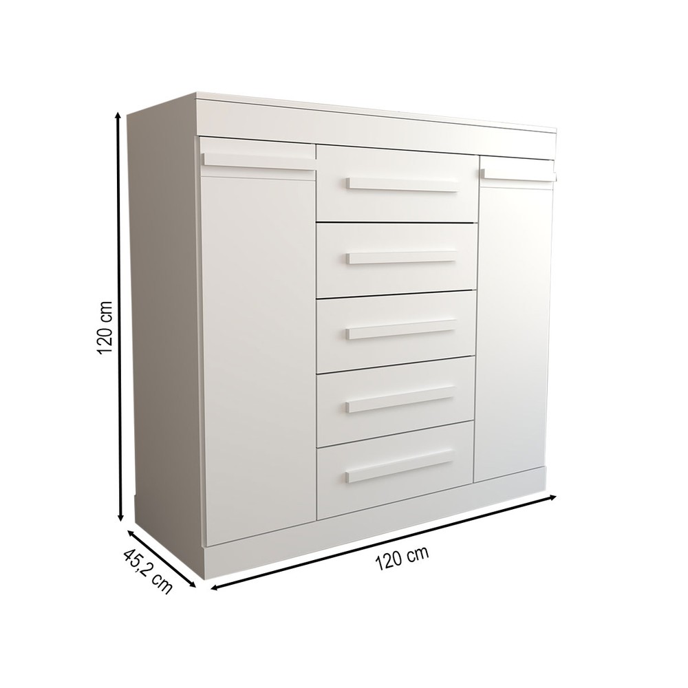O(a) Cômoda Divino 2 Portas 5 Gavetas 100% Mdf Branco - Panorama Móveis é produzido em 100% MDF na escala de brilho Brilhante e Semi-Brilho, e possui um grau de dificuldade de montagem: Médio.