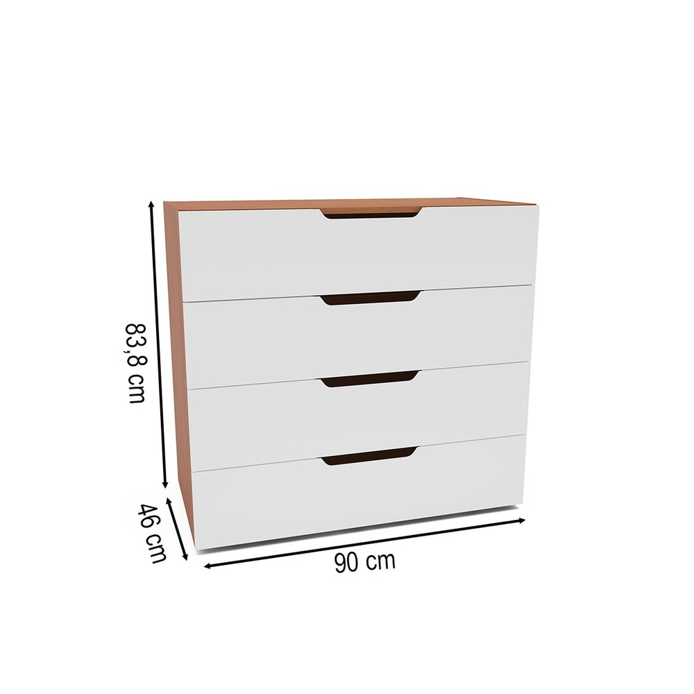 O(a) Cômoda Madri 4 Gavetas Branco/Freijó - Politorno é produzido em MDP na escala de brilho Semi-Fosco, e possui um grau de dificuldade de montagem: Médio.