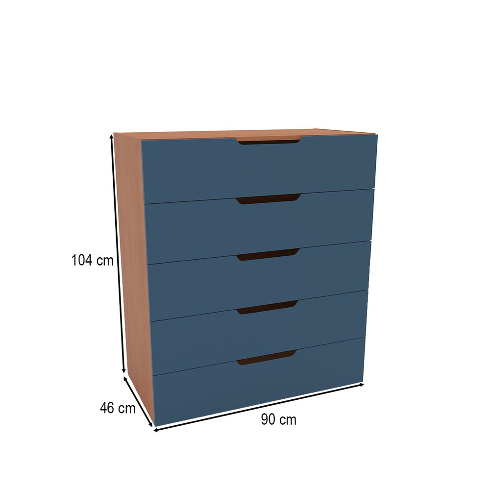 O(a) Cômoda Madri 5 Gavetas Azul/Freijó - Politorno é produzido em MDP na escala de brilho Semi-Fosco, e possui um grau de dificuldade de montagem: Médio.