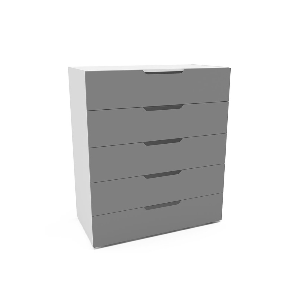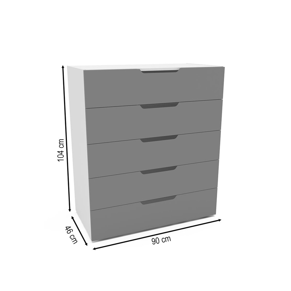 O(a) Cômoda Madri 5 Gavetas Cinza/Branco - Politorno é produzido em MDP na escala de brilho Semi-Fosco, e possui um grau de dificuldade de montagem: Médio.