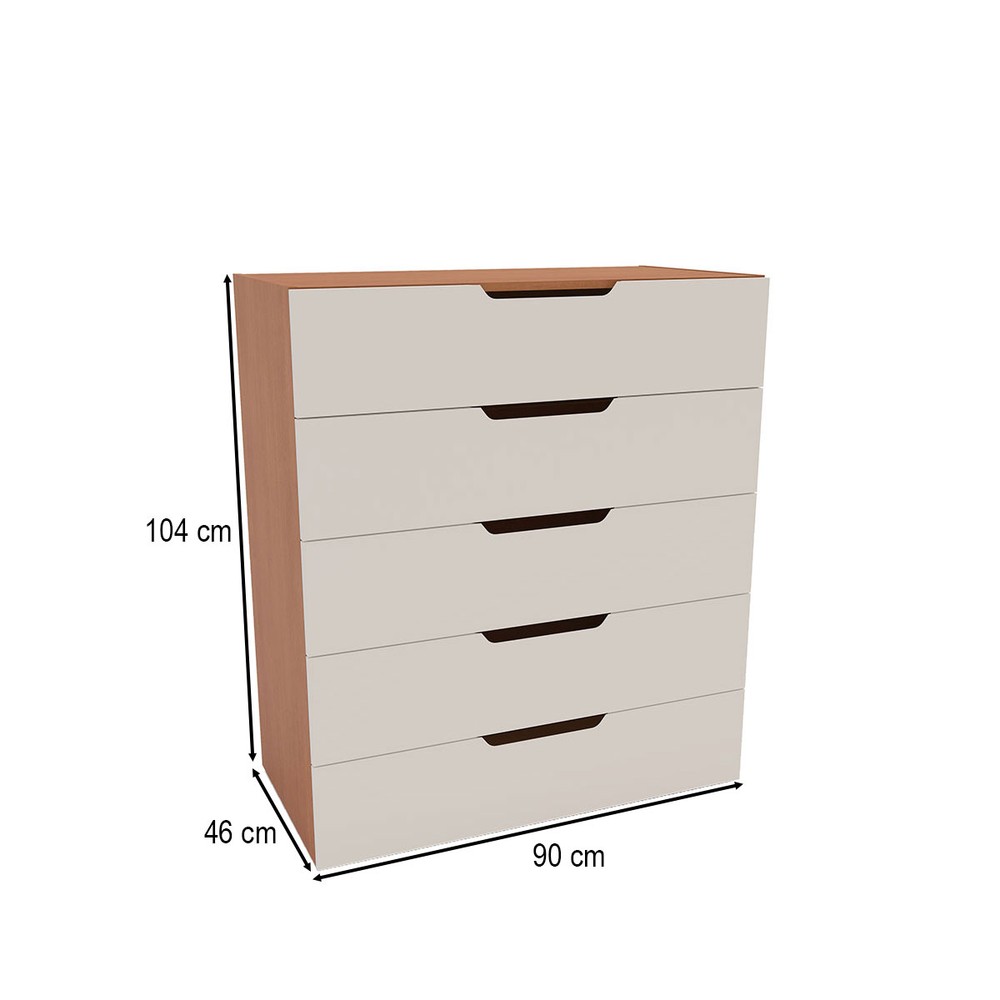 O(a) Cômoda Madri 5 Gavetas Creme/Freijó - Politorno é produzido em MDP na escala de brilho Semi-Fosco, e possui um grau de dificuldade de montagem: Médio.