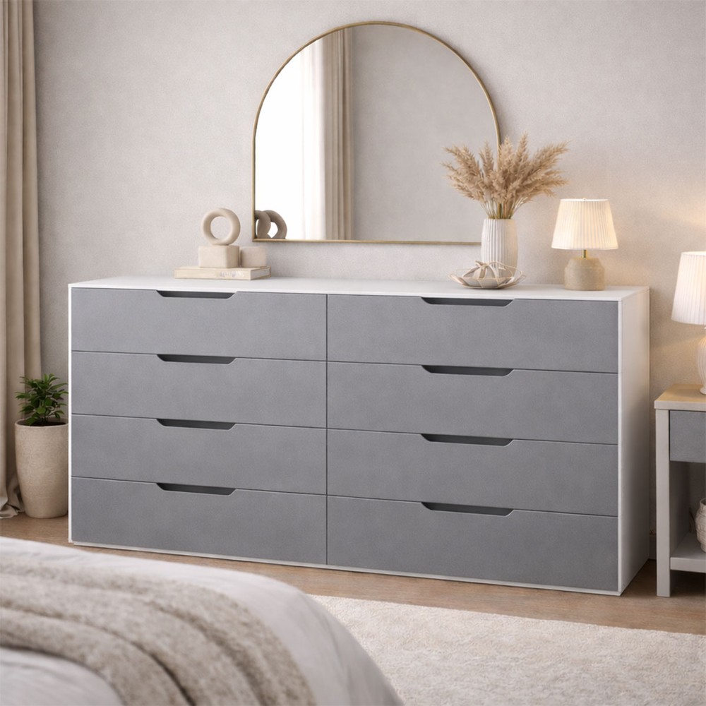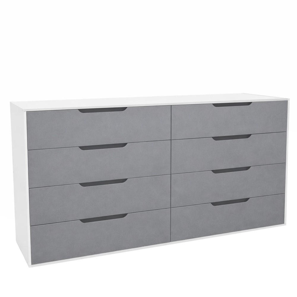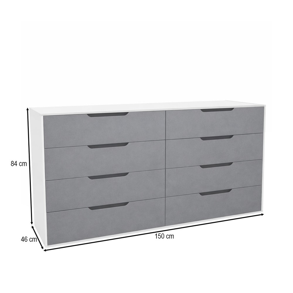 O(a) Cômoda Madri 8 Gavetas Cinza/Branco - Politorno é produzido em MDP na escala de brilho Semi-Fosco, e possui um grau de dificuldade de montagem: Médio.