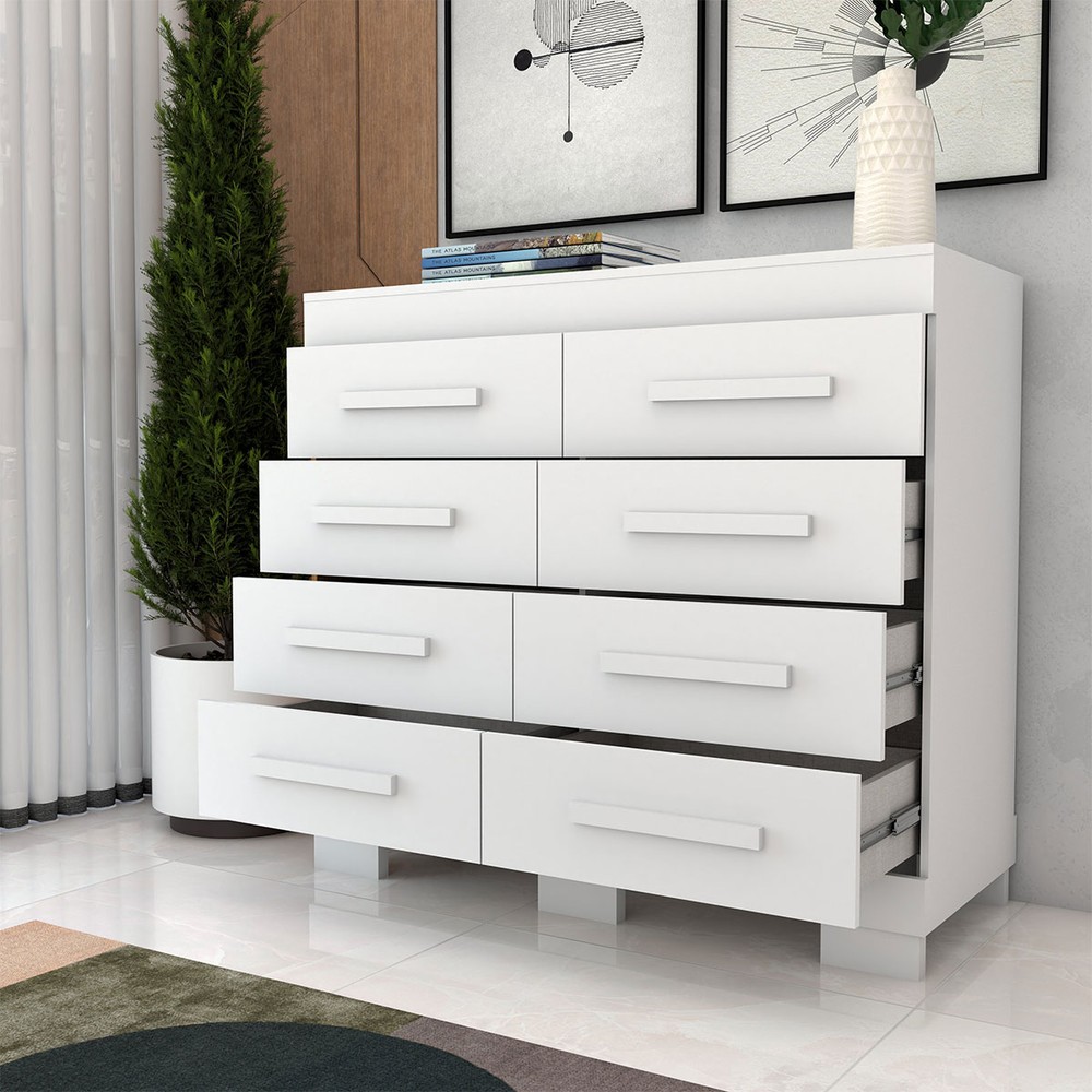 O(a) Cômoda Milano 8 Gavetas 100% Mdf Branco - Panorama Móveis é produzido em 100% MDF na escala de brilho Brilhante e Semi-Brilho, e possui um grau de dificuldade de montagem: Médio.