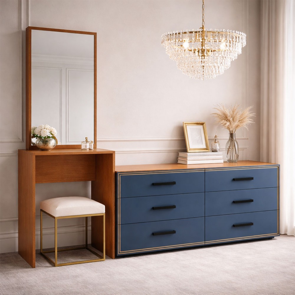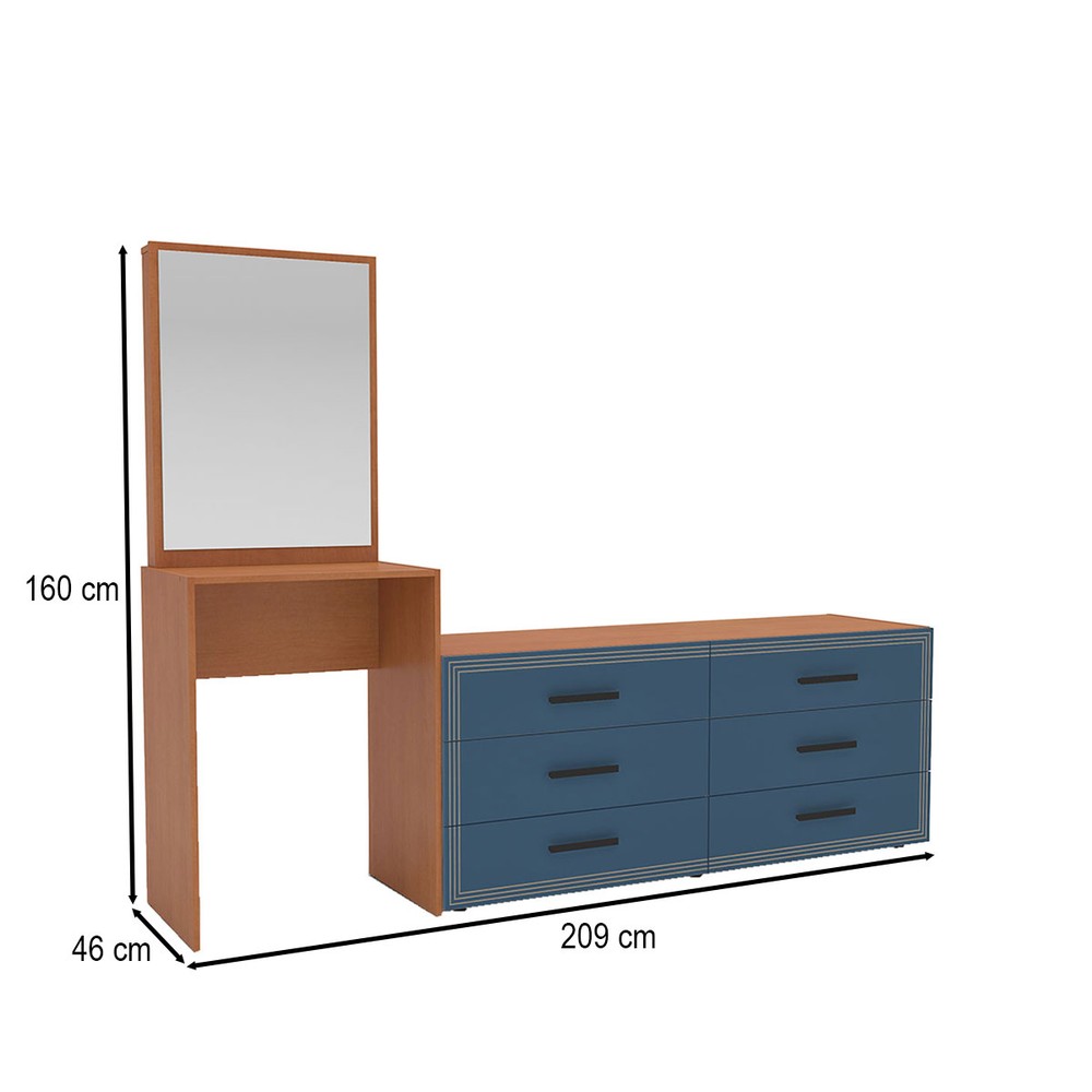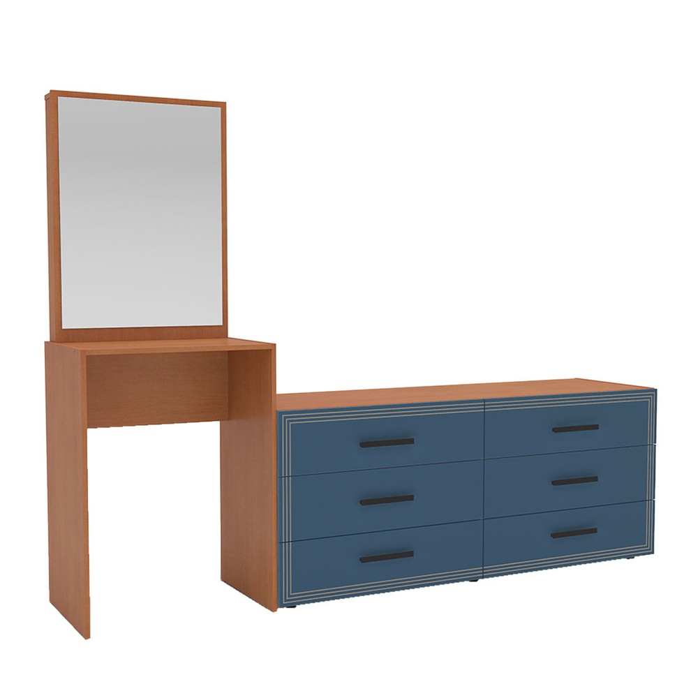Cômoda Valência 6 Gavetas com Espelho Azul/Freijó - Politorno