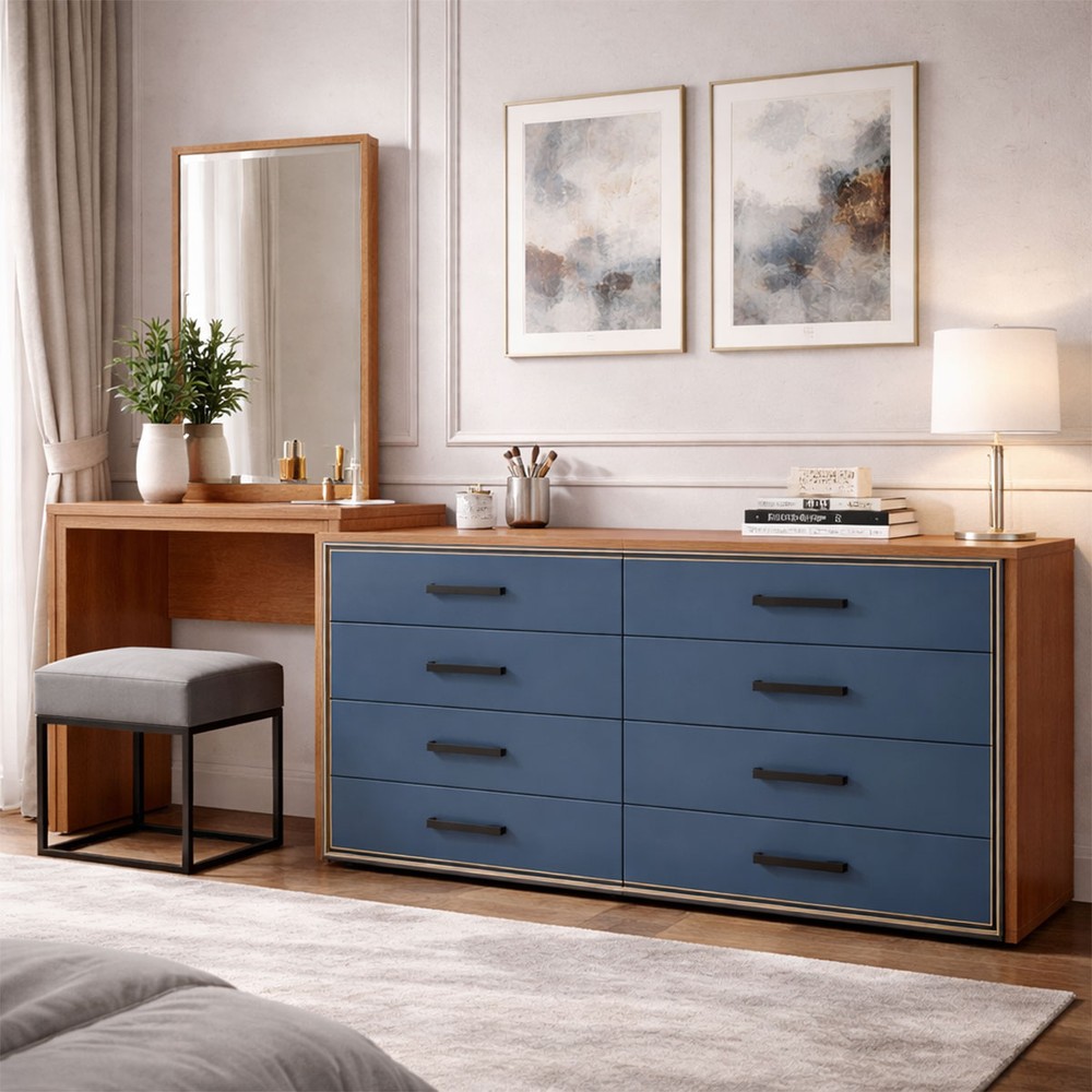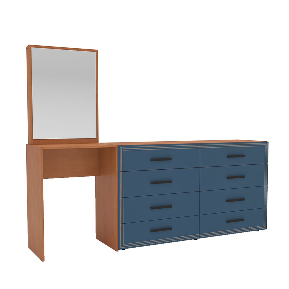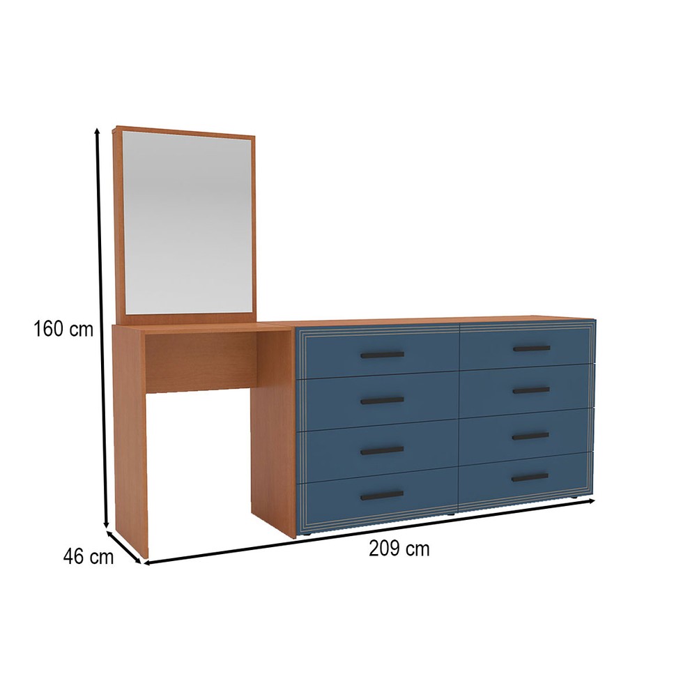 Cômoda Valência 8 Gavetas com Espelho Azul/Freijó - Politorno