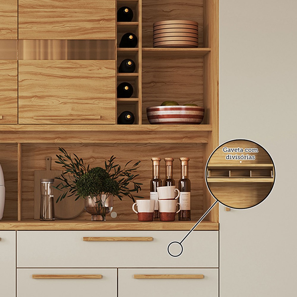 O(a) Cozinha Compacta Touriga 8 Portas 1 Gaveta 100% Mdf com Vidro Amêndoa/Off White - Rio Doce é produzido em 100% MDF na escala de brilho Semi-Brilho, e possui um grau de dificuldade de montagem: Difícil.