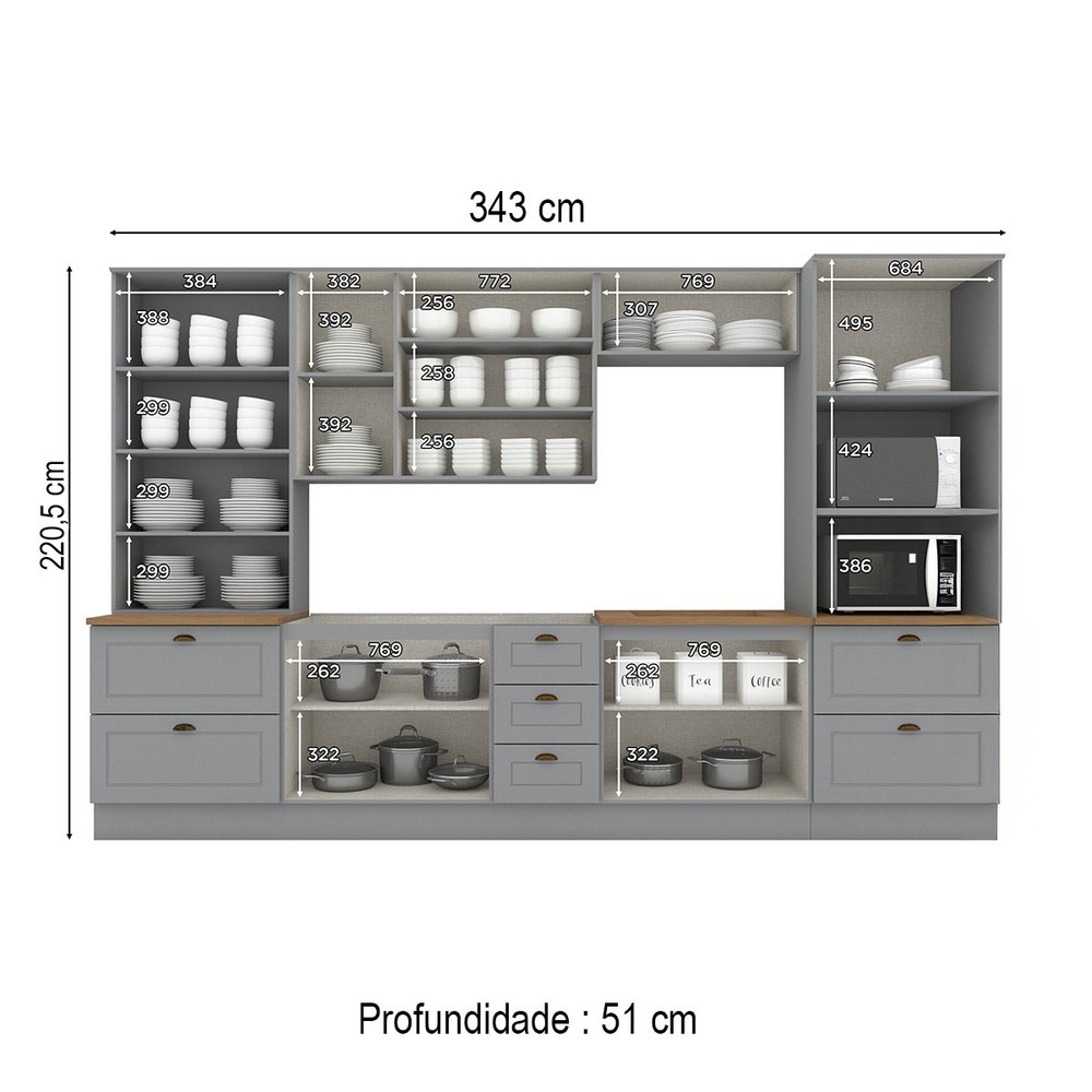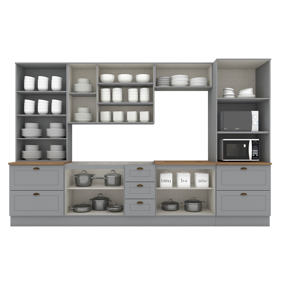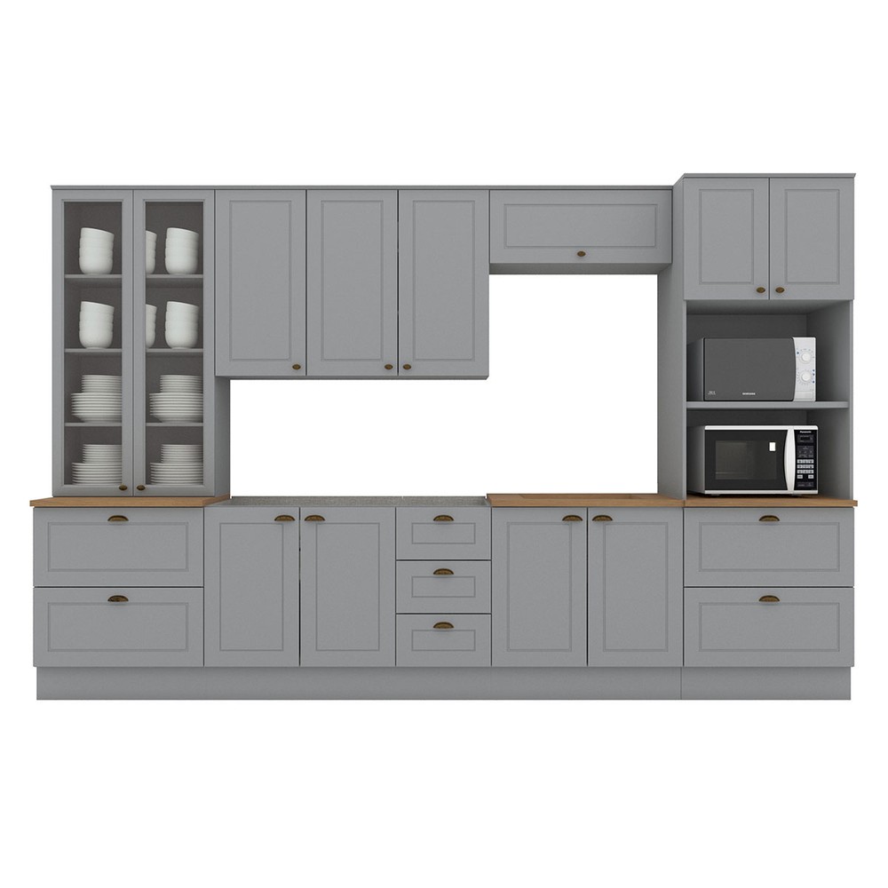Cozinha Completa Americana 12 Portas 7 Gavetas com Vidro 100% Mdf Cinza/Nature - Henn