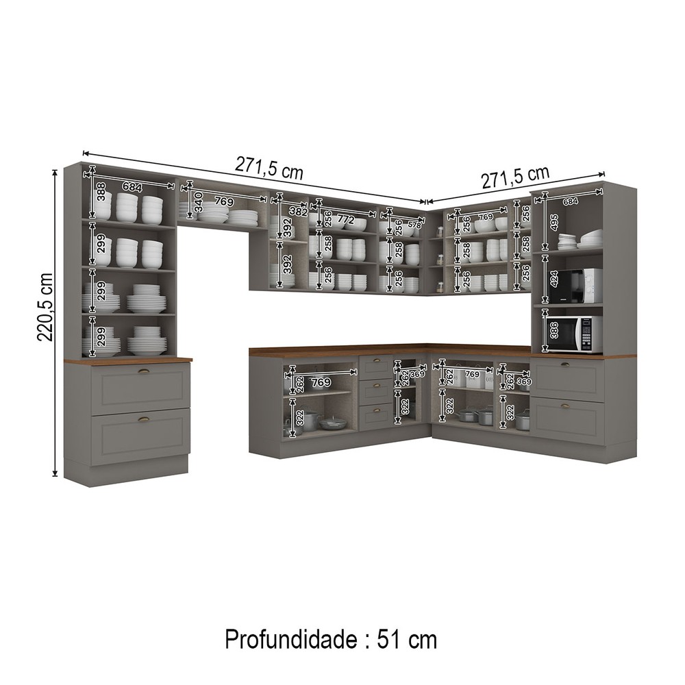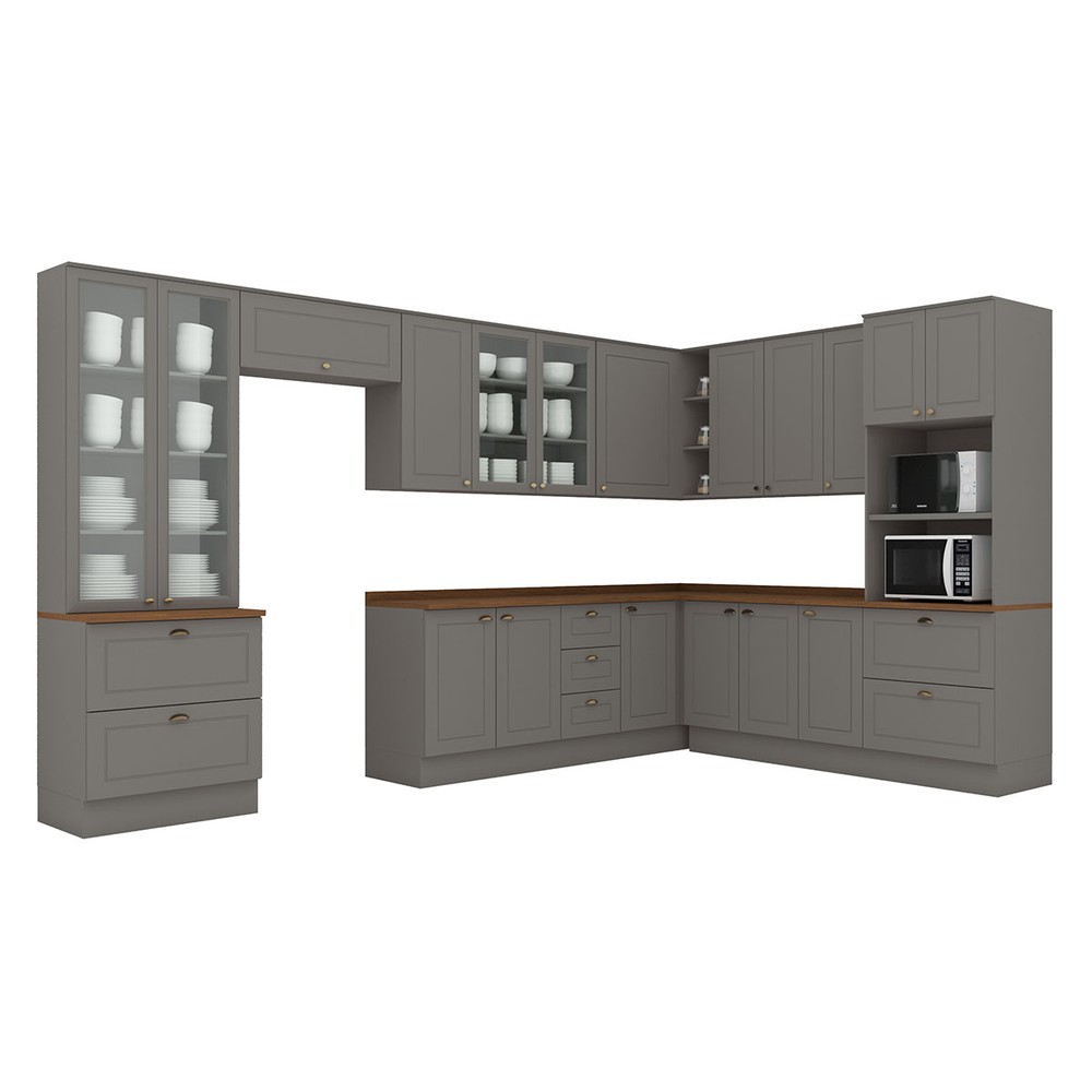 Cozinha Completa Americana 18 Portas 7 Gavetas com Vidro 100% Mdf Cinza/Nature - Henn
