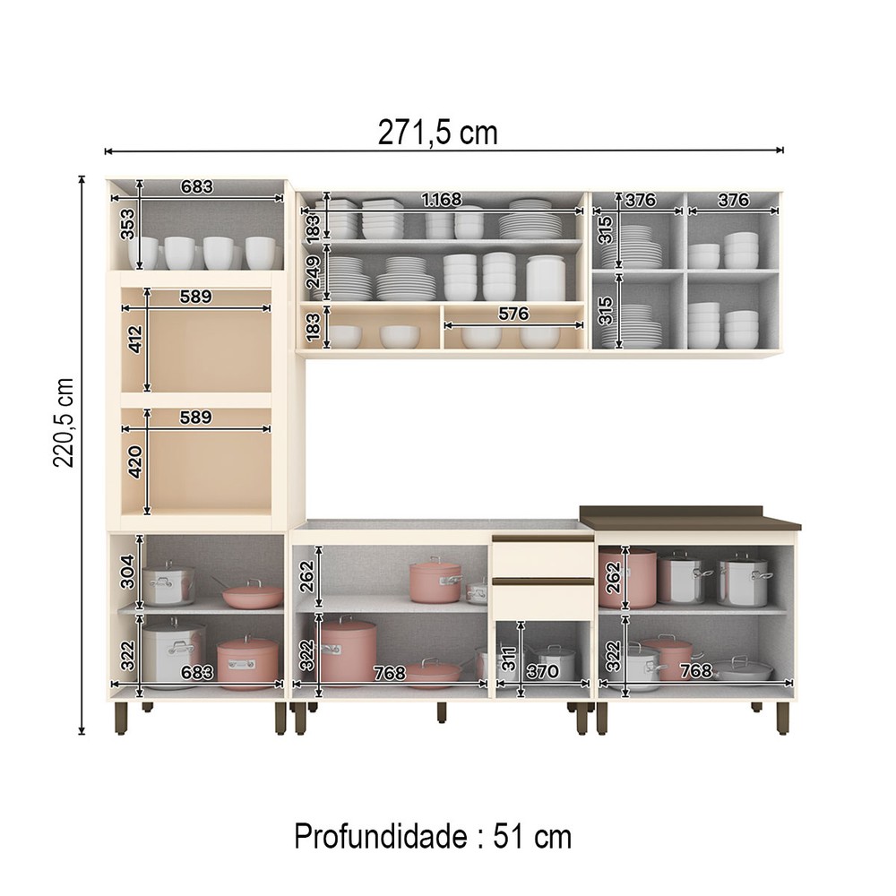 Acompanha 1 Cozinha Completa + Kit Ferragens + Manual de Montagem