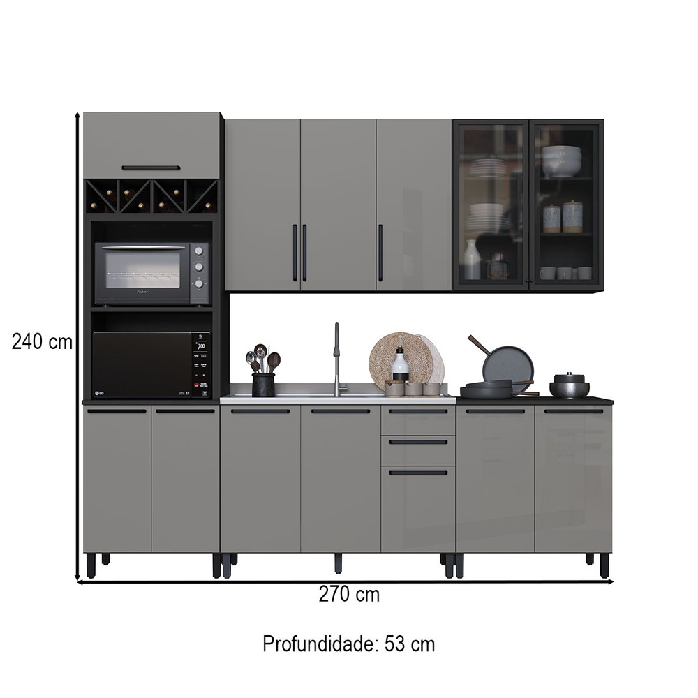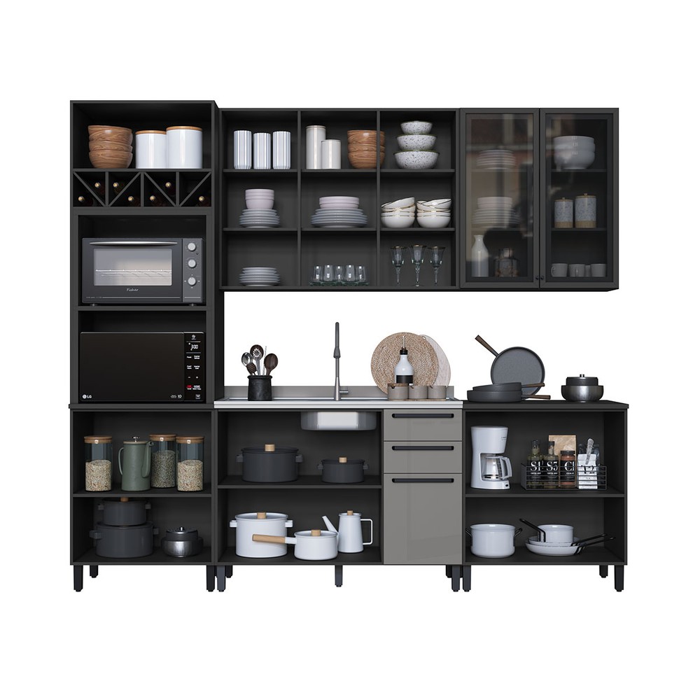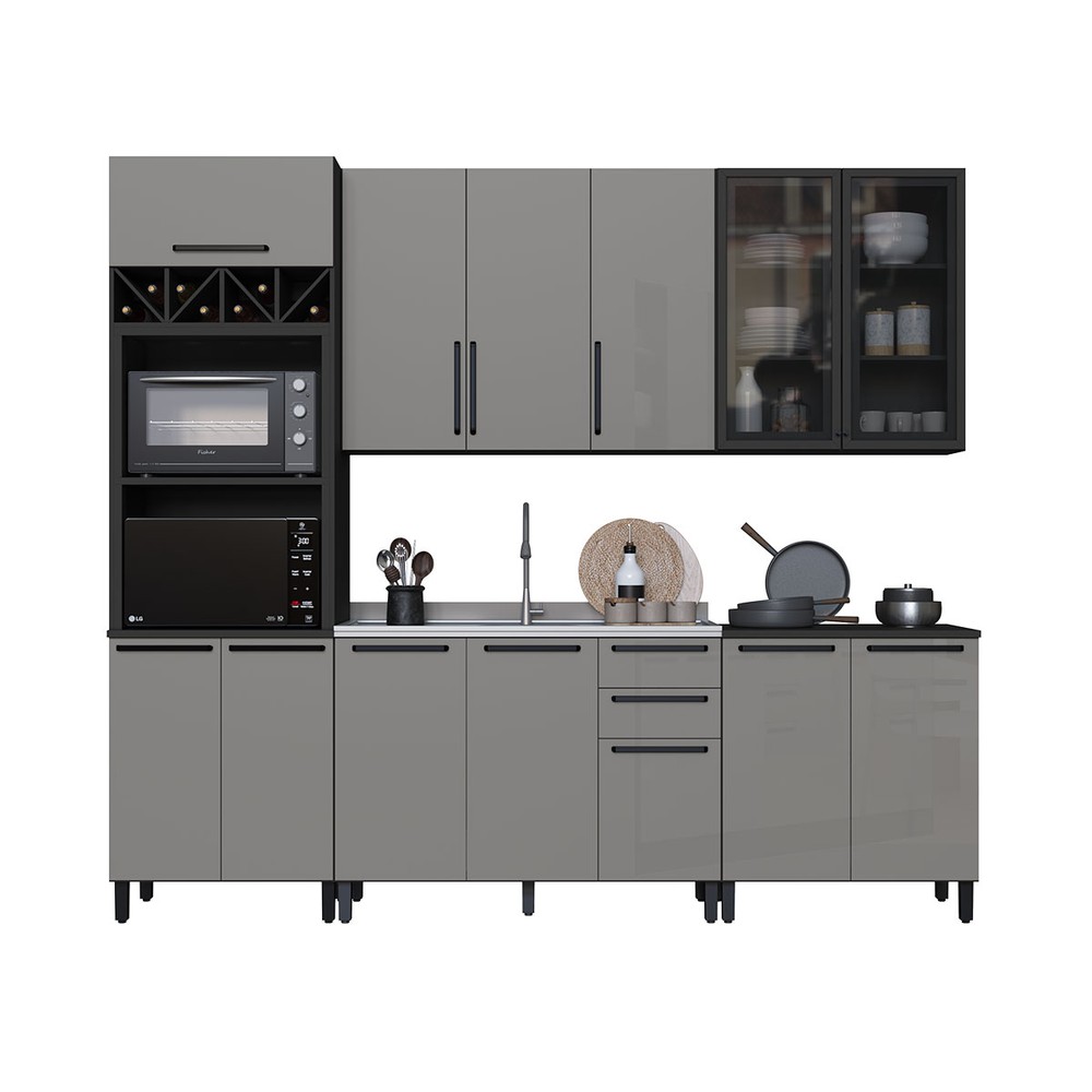 Cozinha Completa Diamante 12 Portas 3 Gavetas com Vidro Chumbo/Titanio - Indékes