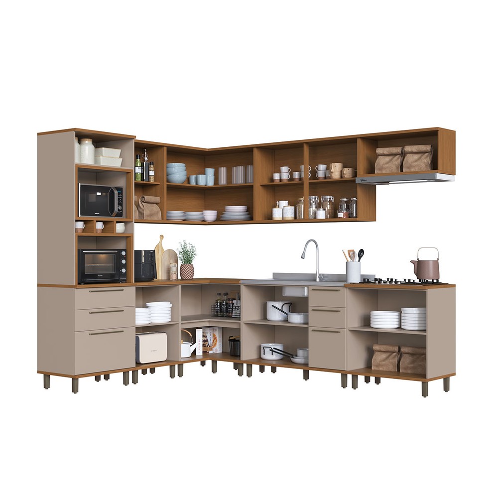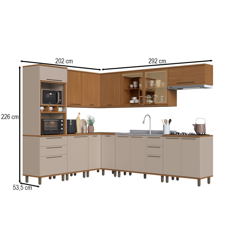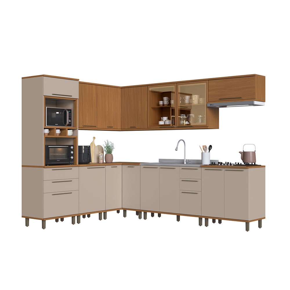 Cozinha Completa Munique 14 Portas 6 Gavetas com Vidro Freijó/Camurça - Indékes