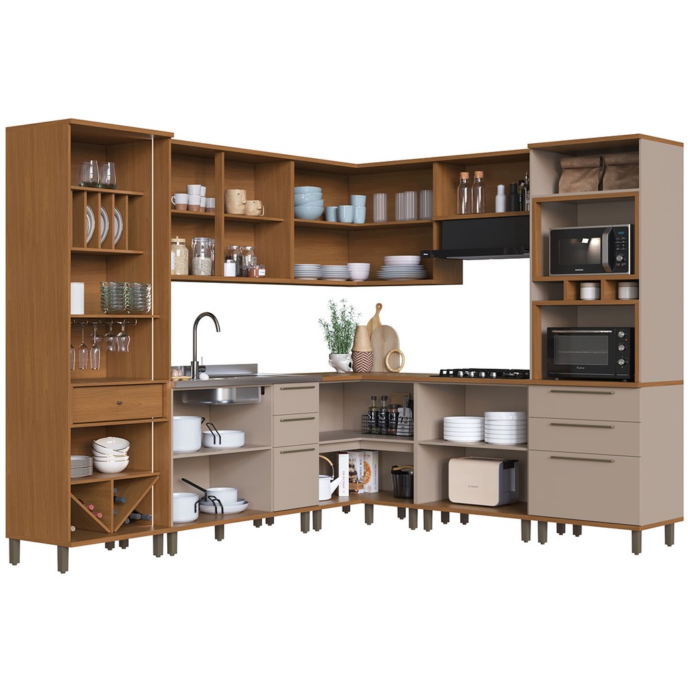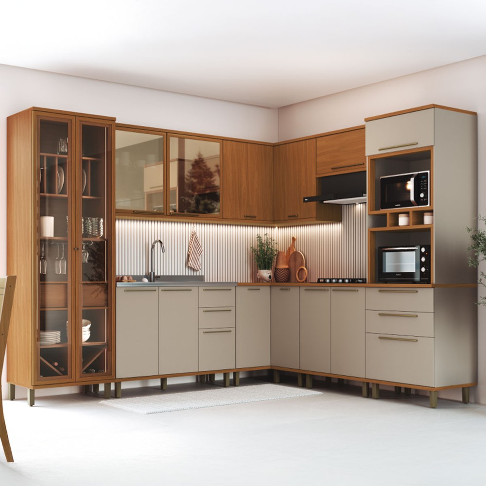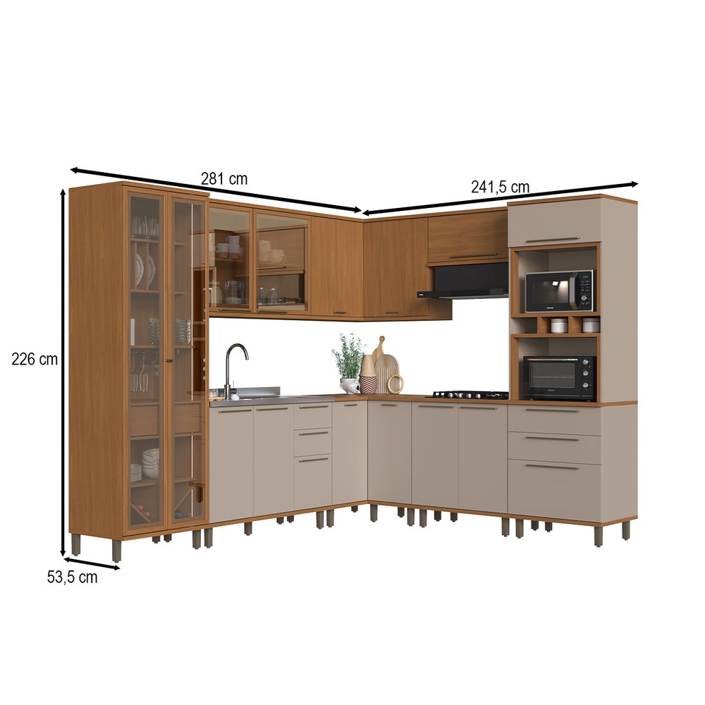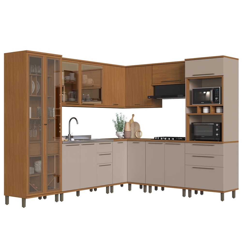 Cozinha Completa Munique 15 Portas 4 Gavetas com Vidro Freijó/Camurça - Indékes