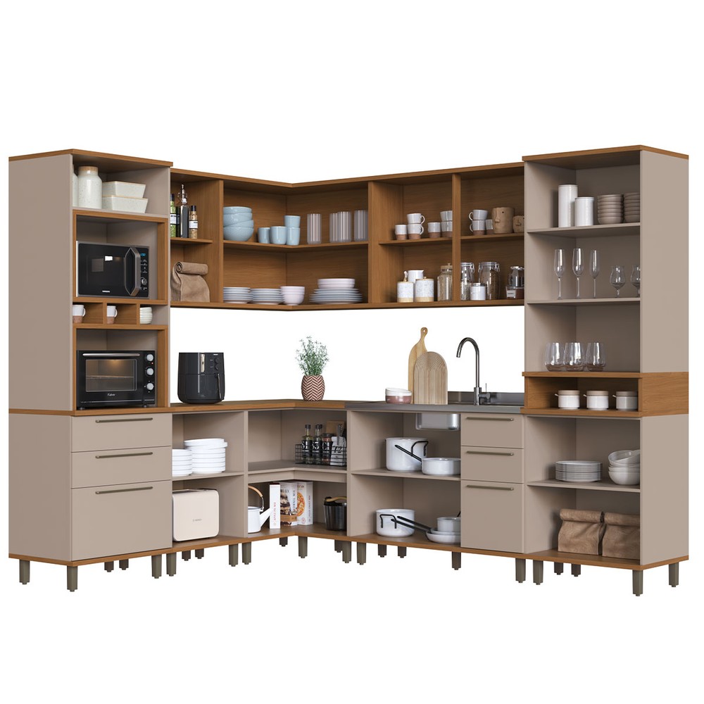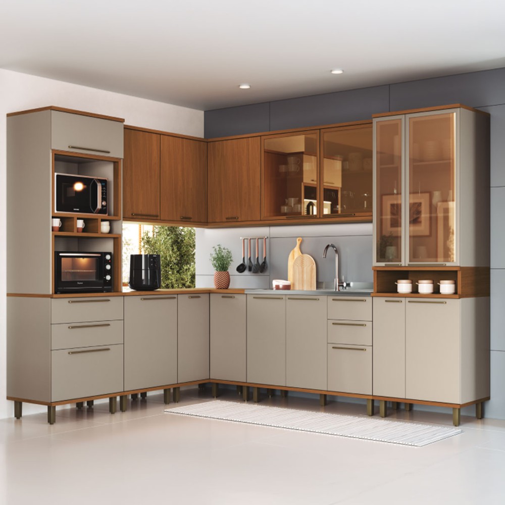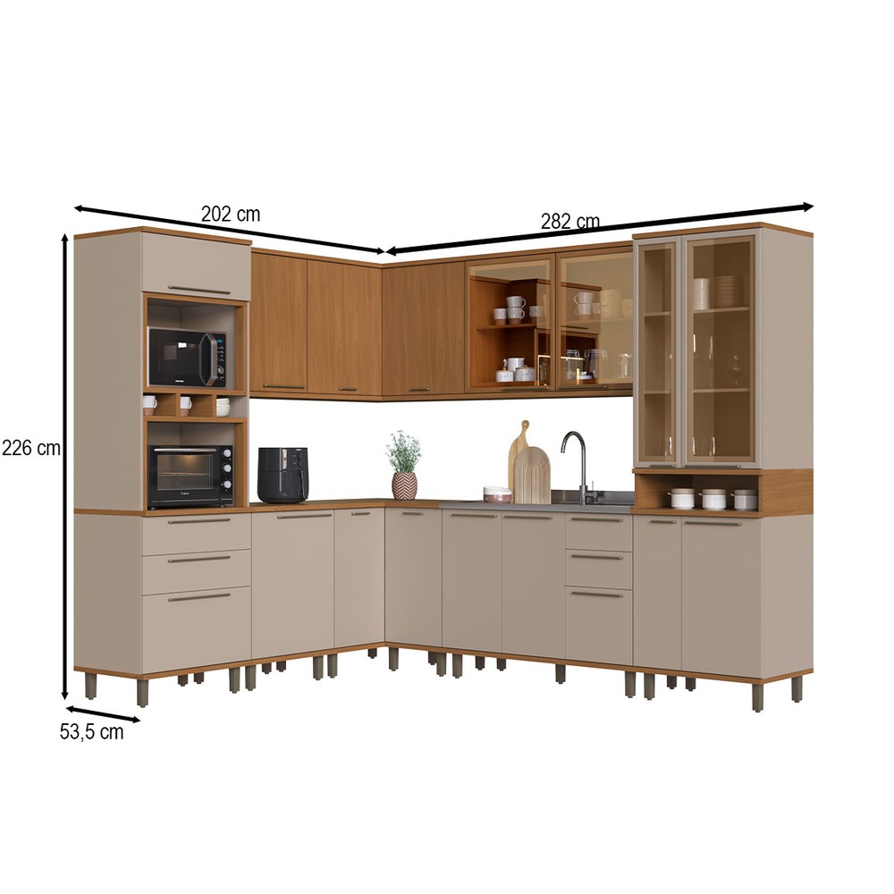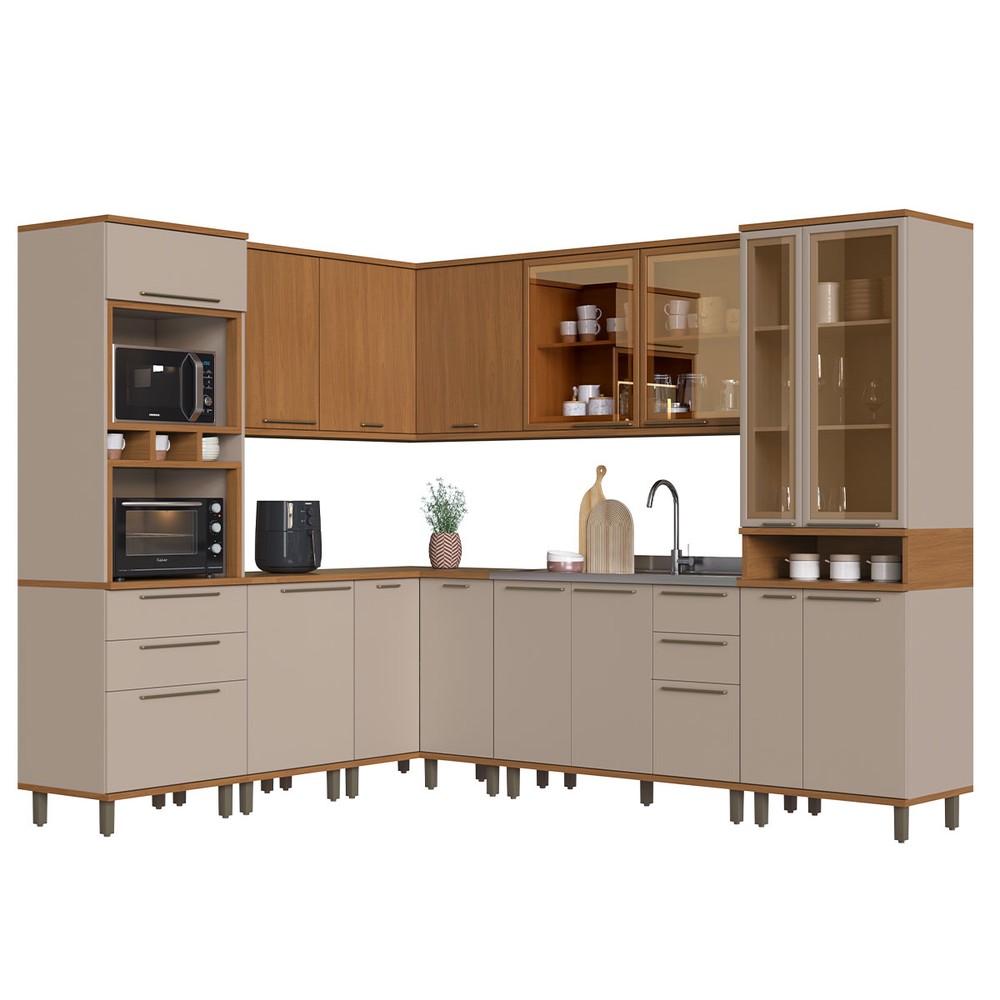 Cozinha Completa Munique 15 Portas 6 Gavetas com Vidro Freijó/Camurça - Indékes