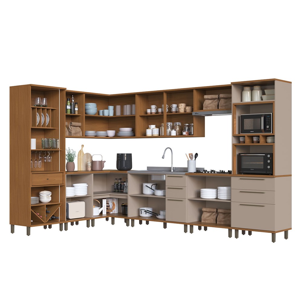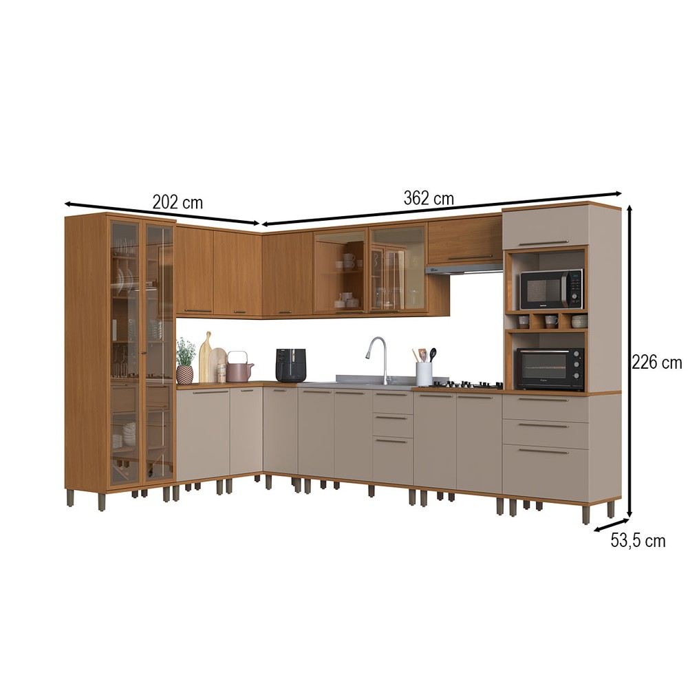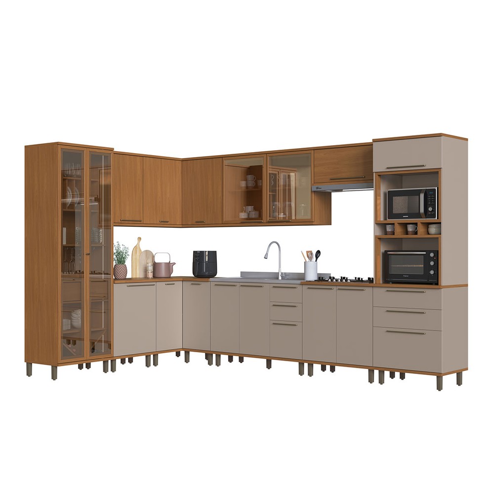 Cozinha Completa Munique 16 Portas 7 Gavetas com Vidro Freijó/Camurça - Indékes