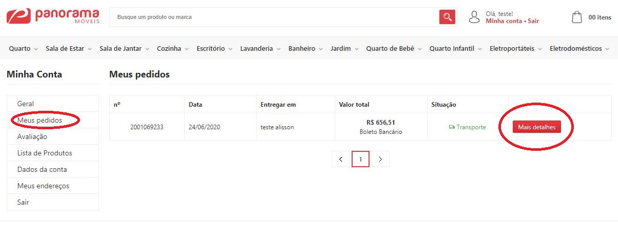 2. Clicar no botão "Meus Pedidos" em seguida no botão "Mais detalhes" conforme print abaixo: