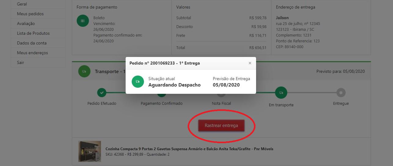 3. Clicar no botão "Rastrear Entrega", lembrando que pedidos que não tenham pagamento confirmado ou não estejam em transporte não teremos o botão, o botão aparece quando o pedido se encontra em transporte. Após clicar o botão "Rastrear Entrega" abrirá uma tela com todos os status de rastreio da transportadora conforme o print abaixo: