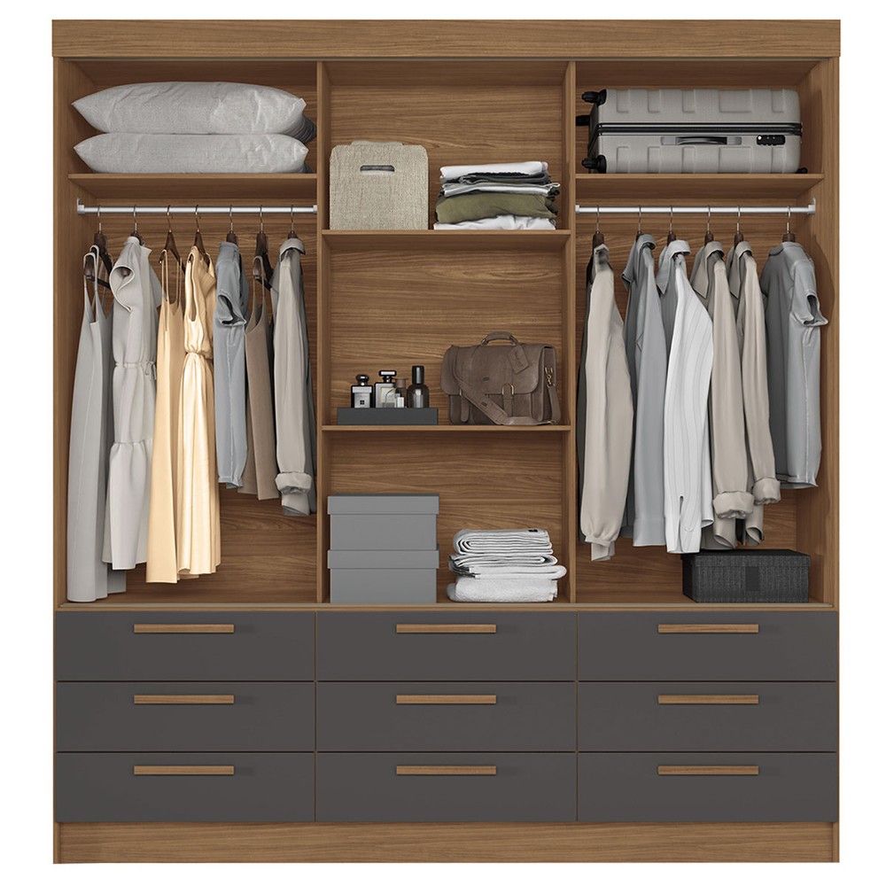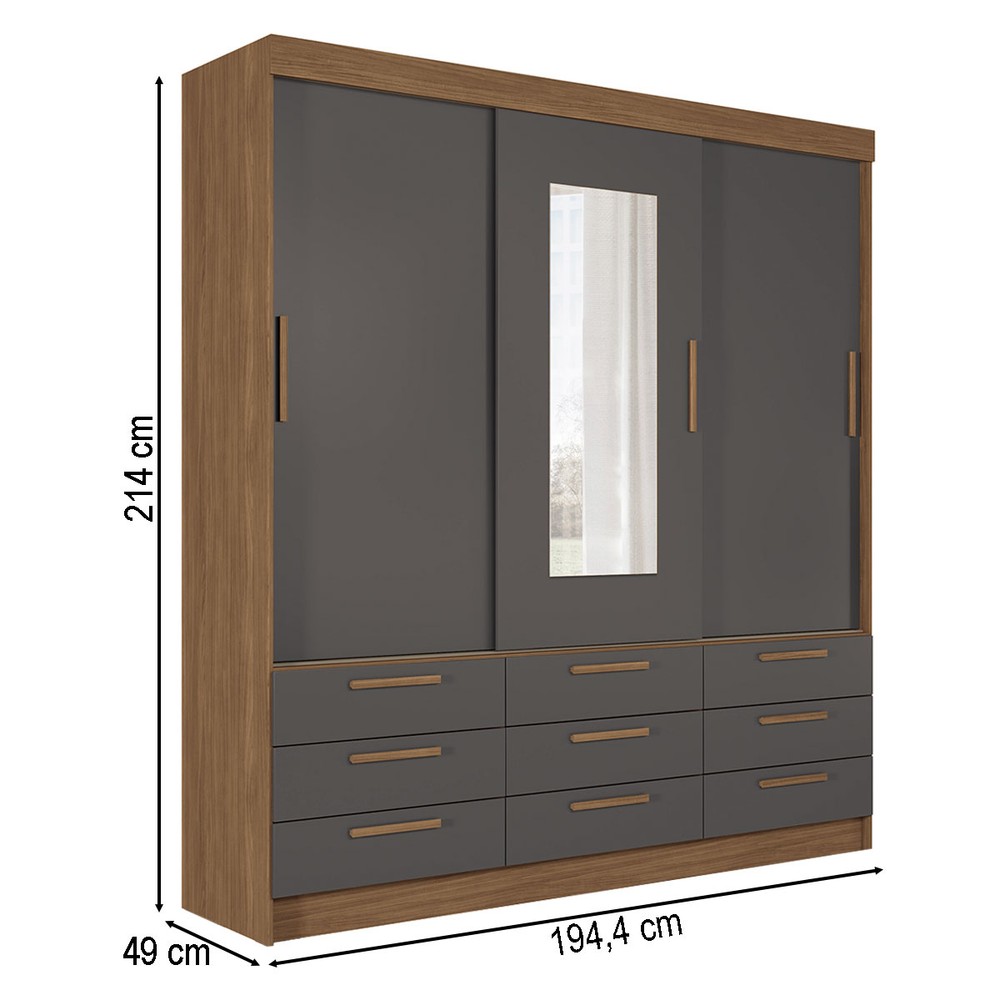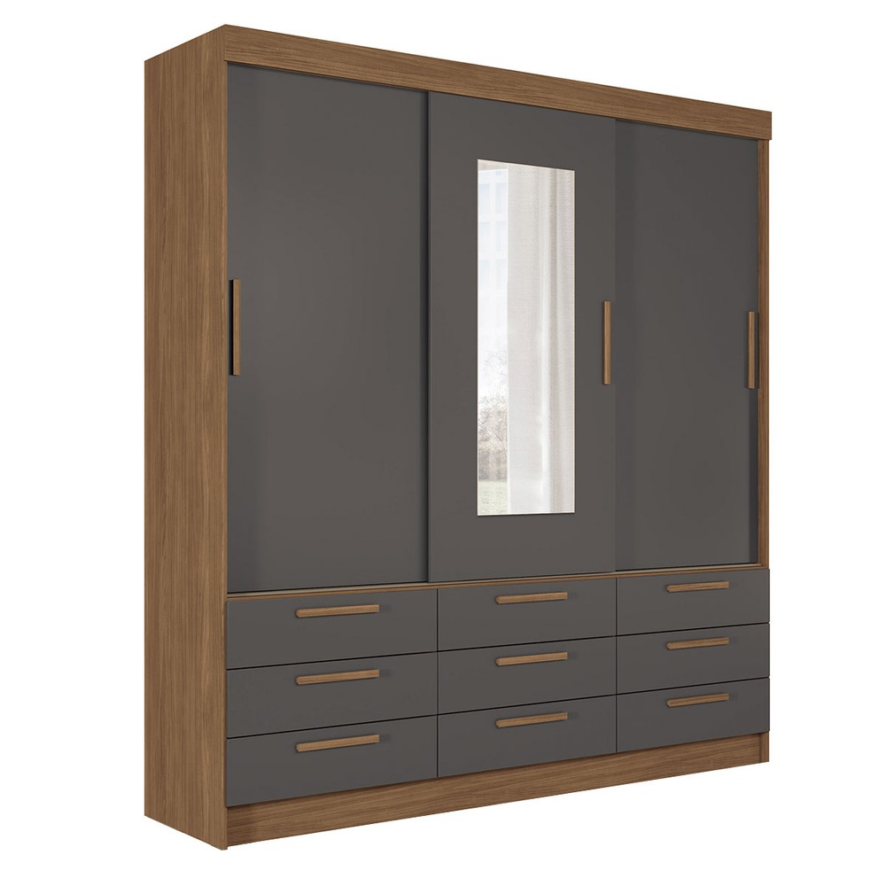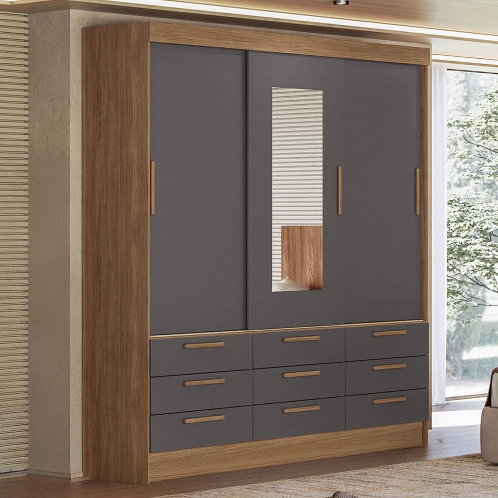 Guarda-Roupa Casal Albatroz 3 Portas 9 Gavetas Jatoba/Grafite com Espelho - Pnr Móveis