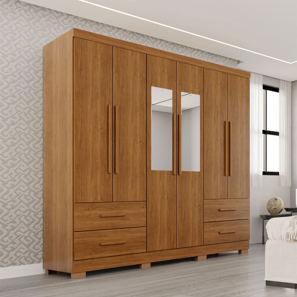 O(a) Guarda-Roupa Casal Balder Premium 6 Portas 4 Gavetas com Pés e Espelho Cinamomo - Pnr Móveis é produzido em MDP na escala de brilho Semi-Fosco, e possui um grau de dificuldade de montagem: Médio.