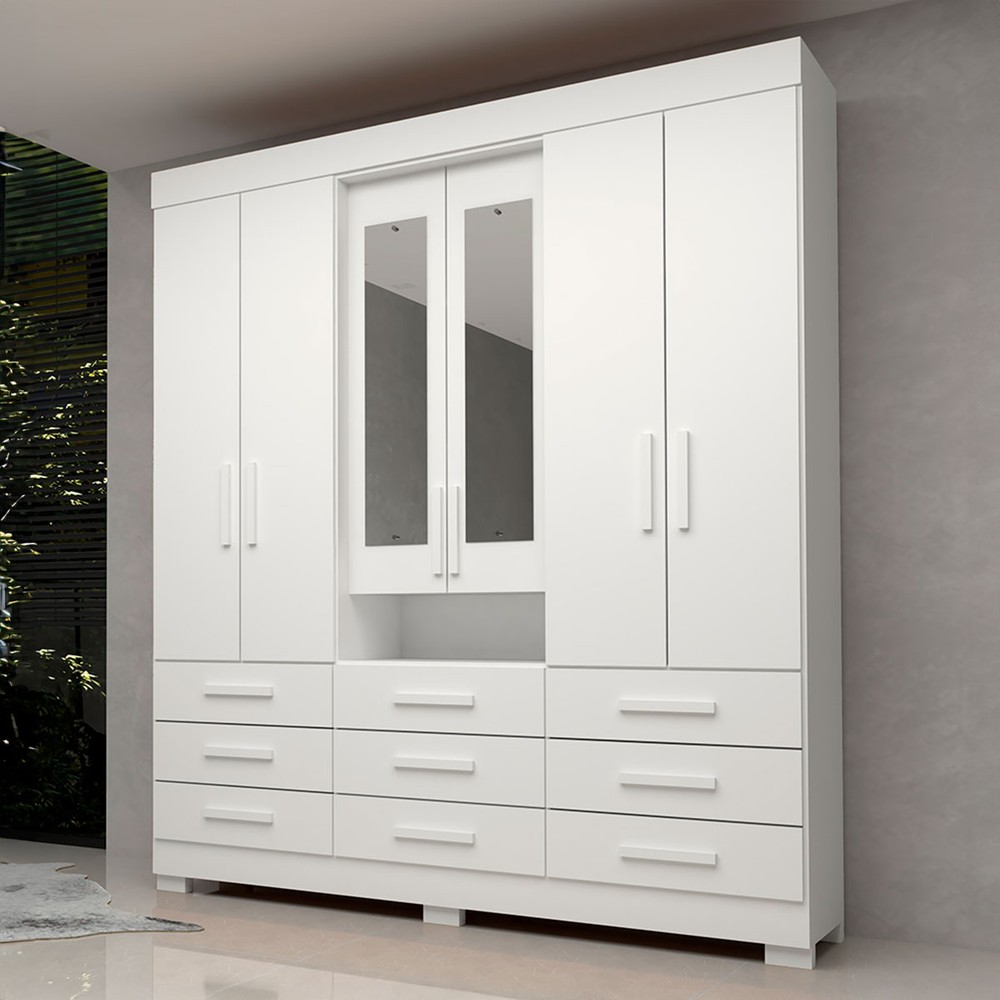 O(a) Guarda-Roupa Casal Débora Capelinha 6 Portas 9 Gavetas com Espelho 100% Mdf Branco - Acp Móveis é produzido em 100% MDF na escala de brilho Brilhante e Semi-Brilho, e possui um grau de dificuldade de montagem: Médio.